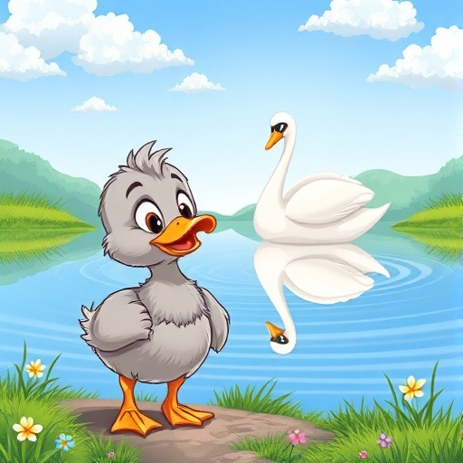 백조들은 웃으며 말했어요. “물에 비친 너를 보렴.”
