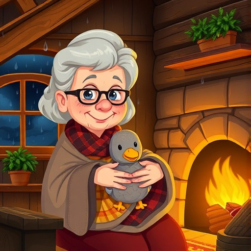 오두막에는 낡은 난로와 작은 침대, 그리고 한 할머니가 있었어요.
