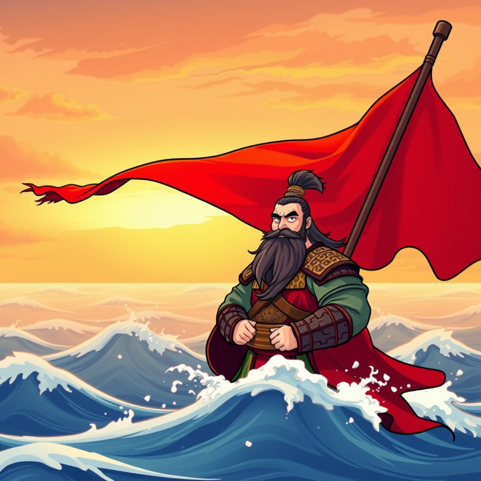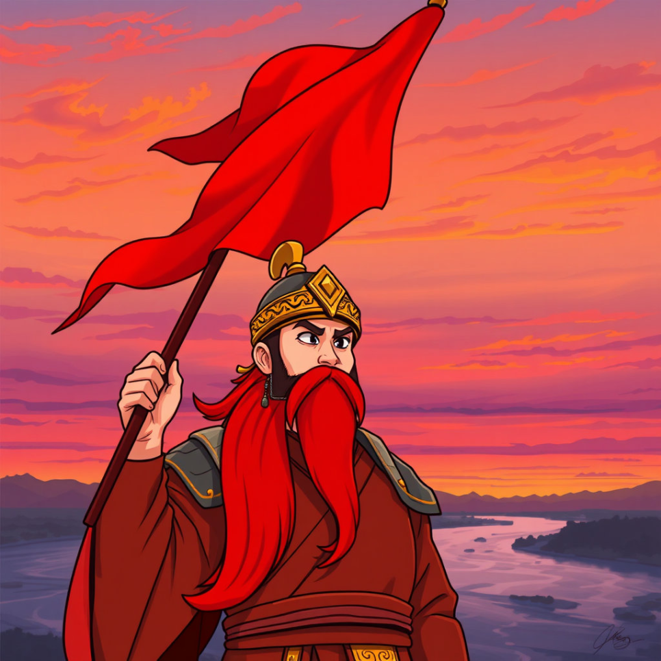 유비는 서쪽으로 떠나게 되었고, 관우는 강을 지키는 일을 맡았어요. 형과 떨어지게 된 관우는 자신의 붉은 깃발을 높이 들고 약속했어요. "내가 이곳을 지키고 있을게. 형님이 돌아올 때까지!" 그는 매일같이 강 위에 깃발을 세우고, 형제의 약속을 지키며 적이 오지 못하도록 경계했지요. 그의 깃발은 희망이자, 맹세의 상징이었어요.