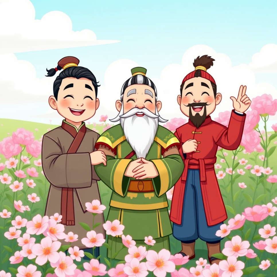 관우는 유비, 장비와 함께 복숭아꽃 피는 밭에서 하늘에 맹세했어요. "우리는 피를 나누진 않았지만, 마음은 형제보다 더 끈끈하다!" 셋은 언제나 서로를 위해 싸우고, 지켜주기로 약속했지요. 그날부터 관우는 자신의 목숨보다 형제를 더 귀하게 여겼답니다. 그 맹세는 오랜 세월이 지나도 변치 않는 강한 약속이 되었어요.