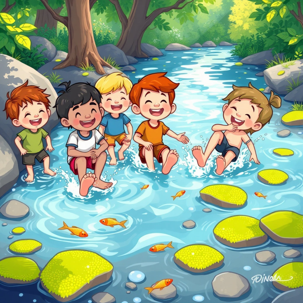 하루 종일 우리는 계곡을 뛰어다니며 놀았어요. 물장구치고, 돌다리 건너고, 숲속 숨바꼭질도 했죠. 때론 작은 다슬기를 찾으며 서로 도왔고, 계곡물에 비친 하늘을 바라보며 웃었어요. 하루가 어떻게 지나갔는지 모를 만큼 즐거웠답니다. 계곡은 우리의 놀이동산이자 자연 교실이었어요.