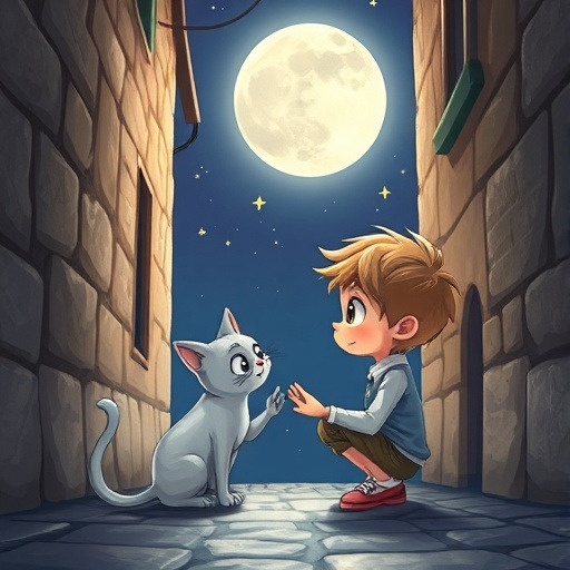 아이와 고양이는 달빛 아래에서 중요한 약속을 나눈다.