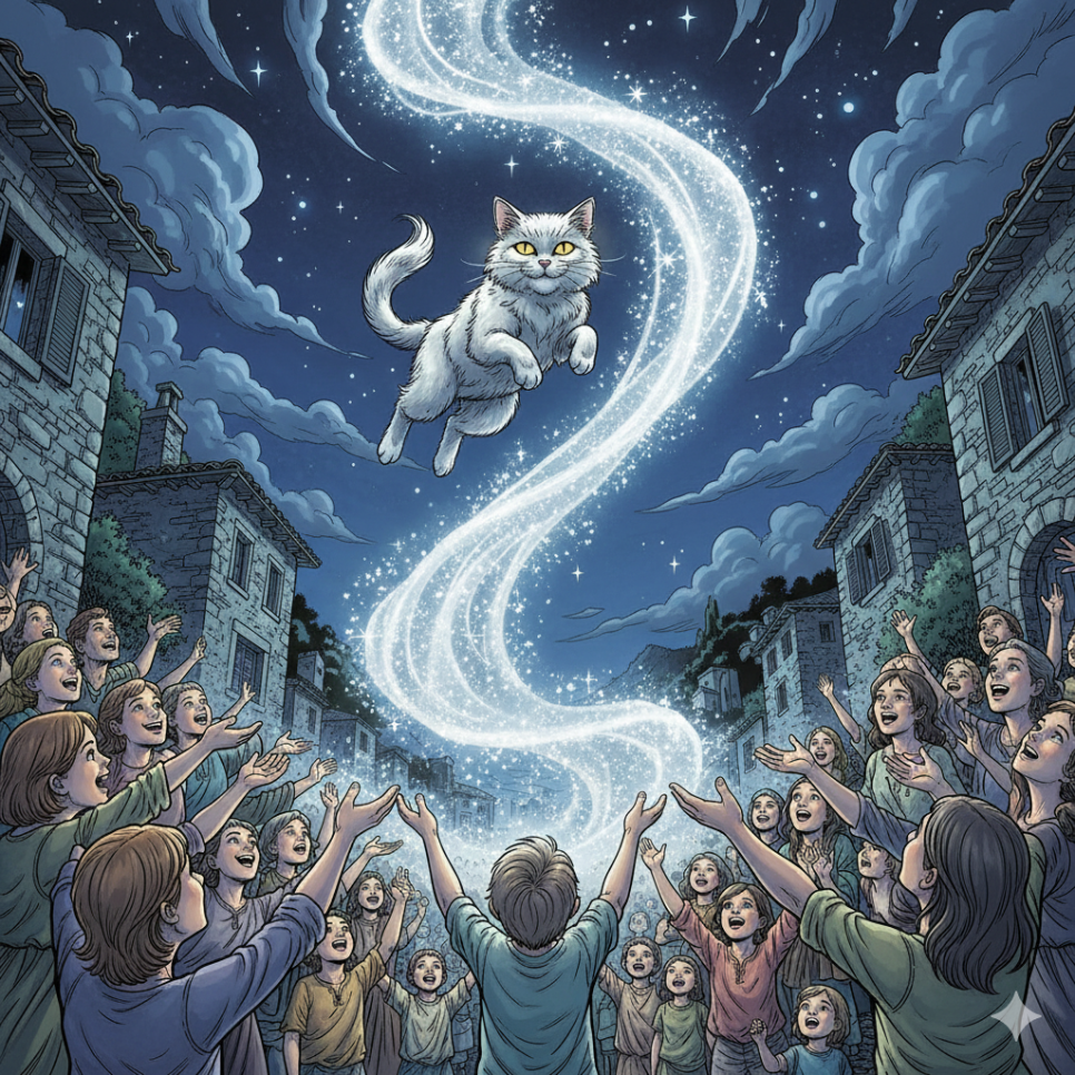 고양이는 마치 말을 알아듣는 것처럼 꼬리를 천천히 흔들었다. 그날 이후 고양이는 마을 곳곳을 돌아다니기 시작했다. 교회 앞 계단, 분수대, 시장 골목까지. 어디를 가든 고양이가 머문 자리는 묘하게 따뜻했고, 사람들의 얼굴에는 미소가 번졌다. 하지만 밤이 되자 고양이는 홀연히 사라지곤 했다.