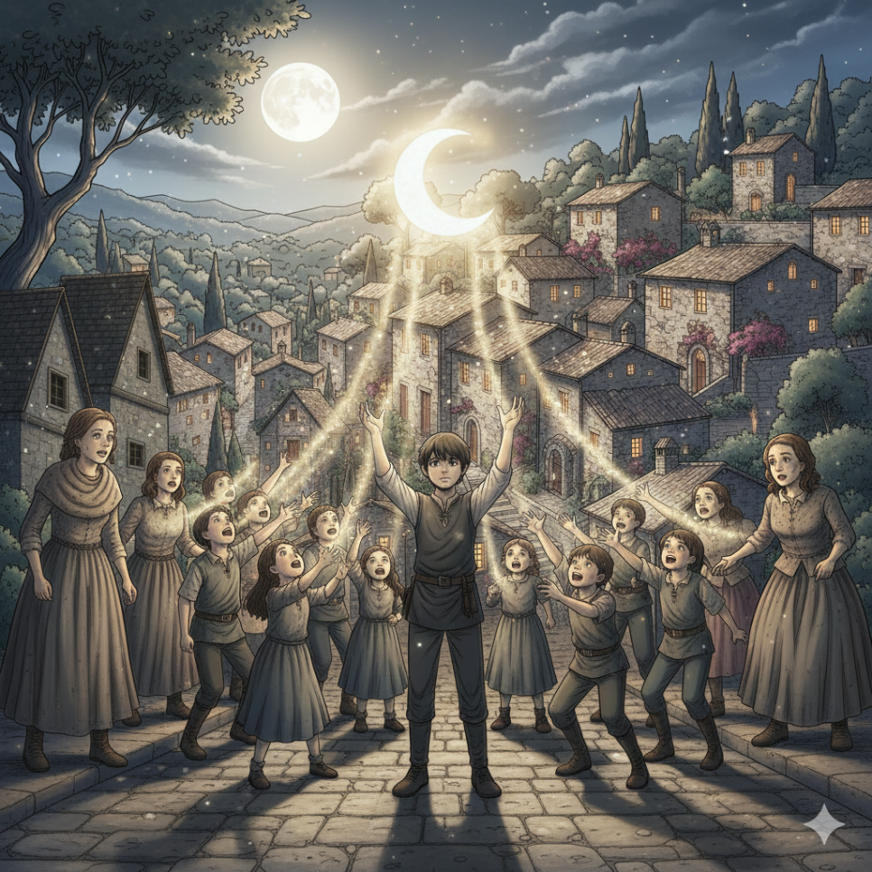 루카와 몇몇 아이들은 힘을 모아 함정을 부쉈다. 금빛 거울이 깨지자 은빛이 흘러나왔다. 그 빛은 하늘로 올라가 달을 다시 밝히기 시작했다. 사람들은 처음으로 함께 행동했다. 욕심 대신 손을 맞잡았다.