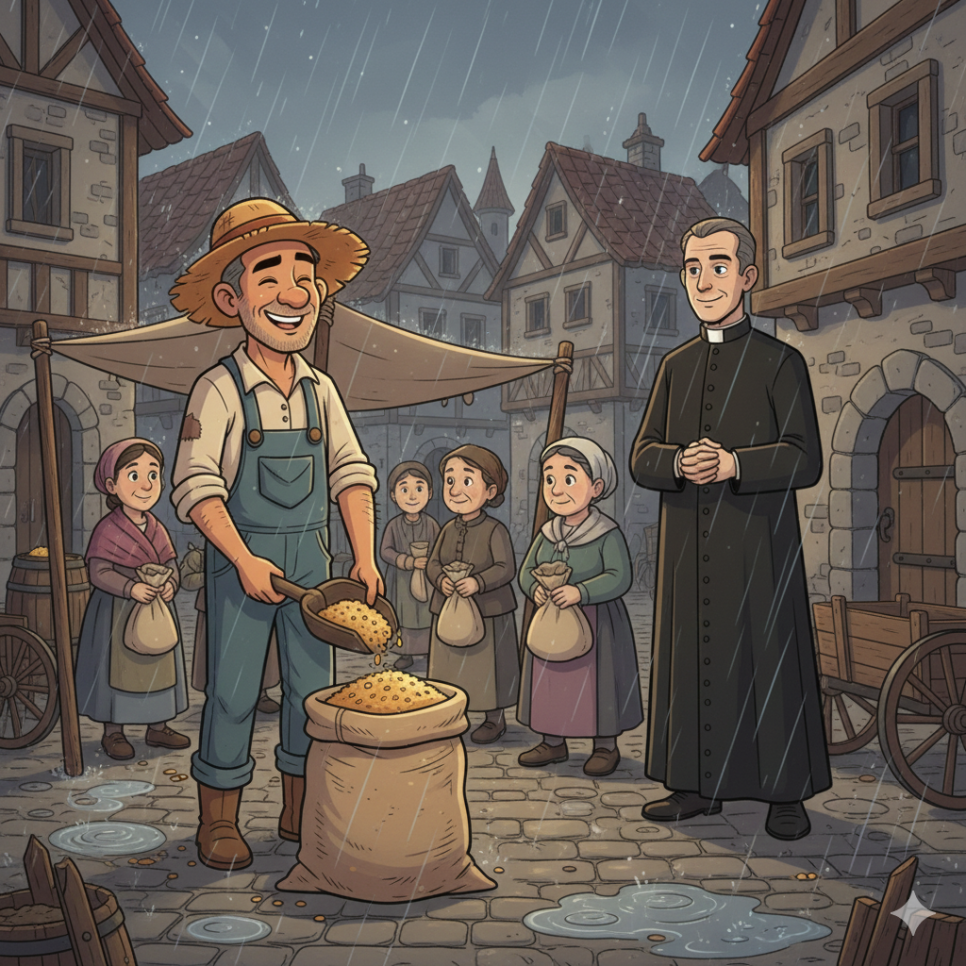 비가 그친 뒤, 사제는 창고를 열었어요. 그런데 밀자루가 줄어든 것처럼 느껴졌지요. 하지만 마을에는 웃음이 돌아왔어요. 아이들은 배불리 먹고 노래했지요. 그제야 사제는 깨달았어요. 사라진 것은 곡식이 아니라, 나누지 않았던 자신의 마음이었다는 걸요.