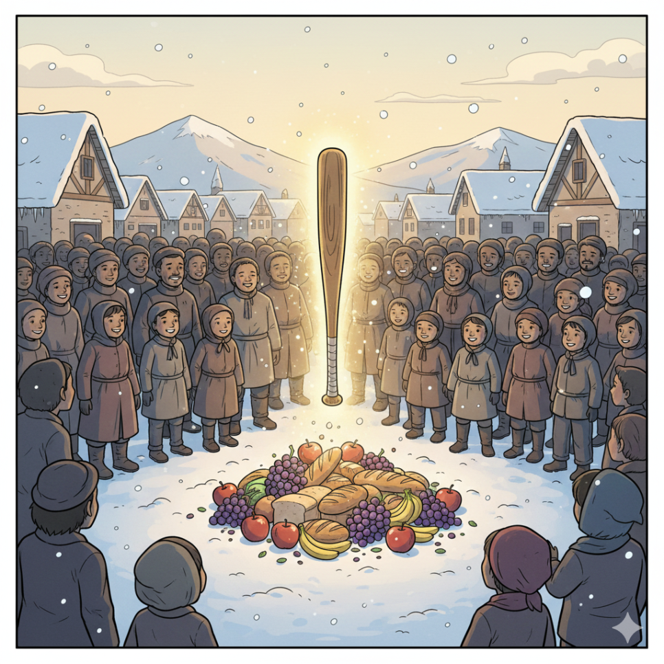 겨울이 찾아오자 마을은 더 가난해졌다. 마테오는 방망이로 음식을 만들었지만, 늘 필요한 만큼만 불러냈다. 그는 혼자 배부르지 않았고, 가장 힘든 사람부터 도왔다. 방망이는 점점 더 따뜻한 빛을 내기 시작했다. “나눔은 마법을 강하게 한다.” 방망이의 말에 마테오는 웃었다. 그는 이제 마법보다 사람들의 웃음을 더 좋아하게 되었다.