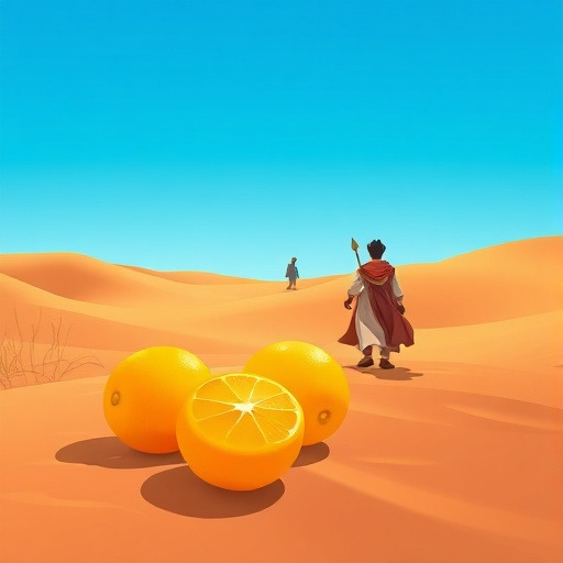 왕자는 위험한 여행을 떠나 사막 너머의 오렌지를 찾아 나섭니다.