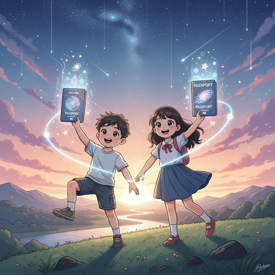지구의 아침 하늘은 유난히 반짝였다. 태양이 뜨기도 전에 하늘 끝에서 달빛이 은색 리본처럼 길게 흘러내리고 있었기 때문이다. 그날, 민호와 아린은 평소와 다르게 심장이 두근거렸다. 마침내 기다리고 기다리던 미래 우주여권이 도착하는 날이었기 때문이다. 우체국 드론이 집 앞에 내려앉자 두 아이는 서로 먼저 열어 보겠다며 달려갔다.