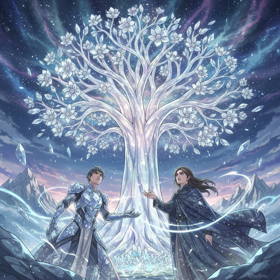정원 중앙에는 커다란 수정 나무가 서 있었고, 그 나무는 마치 달의 심장처럼 고요하게 빛을 내고 있었다.