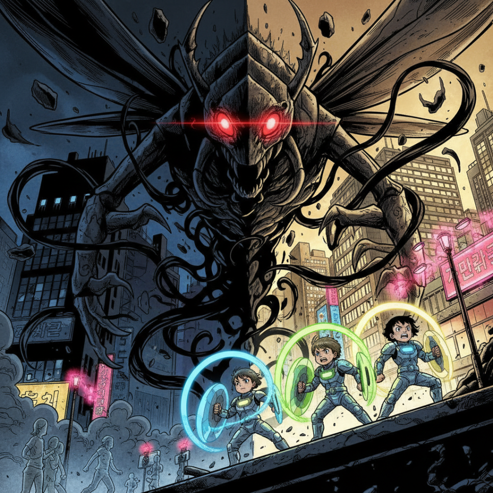 하지만 평화로운 시간은 오래가지 않습니다. 우주에서 빛을 먹는 괴물 ‘어둠벌레’가 나타나 미래도시의 빛을 하나둘 삼키기 시작한 것입니다. 모두가 두려움에 떨 때, 아이들은 서로의 손을 잡습니다. 아주 작은 빛이라도 함께 모으면 어둠을 물리칠 수 있다는 믿음으로, 아이들은 각자의 마음빛을 모아 거대한 빛 구슬을 만들어냅니다.