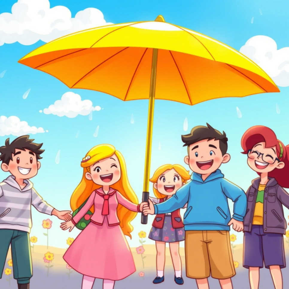 노란 우산 아래에서 셀브루와 친구들은 서로의 손을 꼭 잡고 있었어요. 함께할 때 더 큰 힘이 난다는 걸 알게 되었죠. 마법 같은 우산처럼, 서로의 마음도 반짝이며 따뜻해졌답니다.