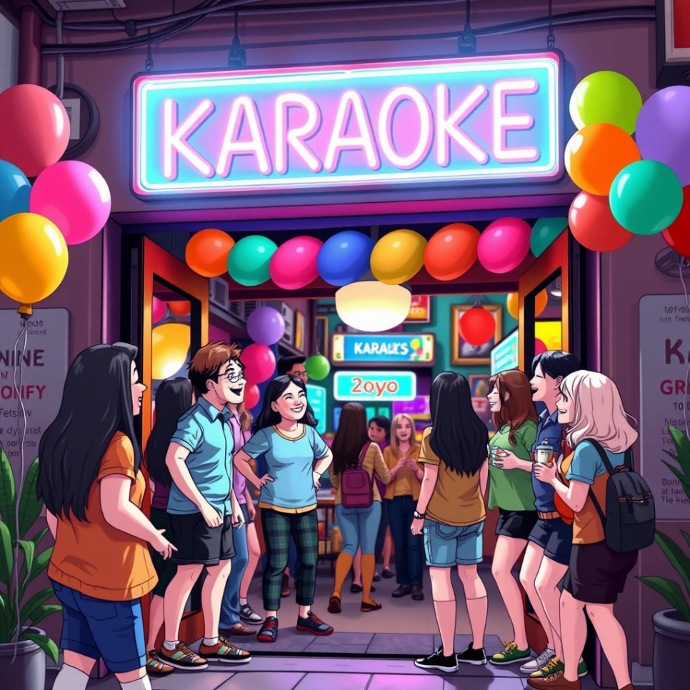 노래방 입구에 다다르자 벌써 친구들이 모여 있었어요. 수아, 도윤, 하린이까지! “안녕! 우리 드디어 만났네!” 다들 반갑게 손을 흔들며 웃었어요. 노래방 앞에는 풍선도 달려 있었고, 도윤이는 좋아하는 공룡 모자도 쓰고 왔어요. “우리 안에서 제일 신나는 노래 불러보자!” 하린이가 말했어요. 친구들은 손을 잡고 신나게 노래방 안으로 들어갔어요. 조명이 반짝, 노래 기계도 반짝! 진짜 파티가 시작됐어요.