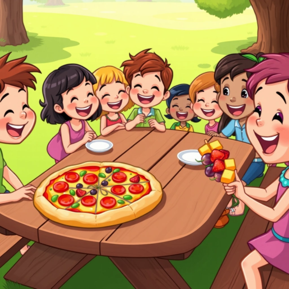 테이블 위에는 치즈 피자, 귀여운 과일 꼬치, 오렌지 주스, 그리고 미니 핫도그가 놓여 있었어요.