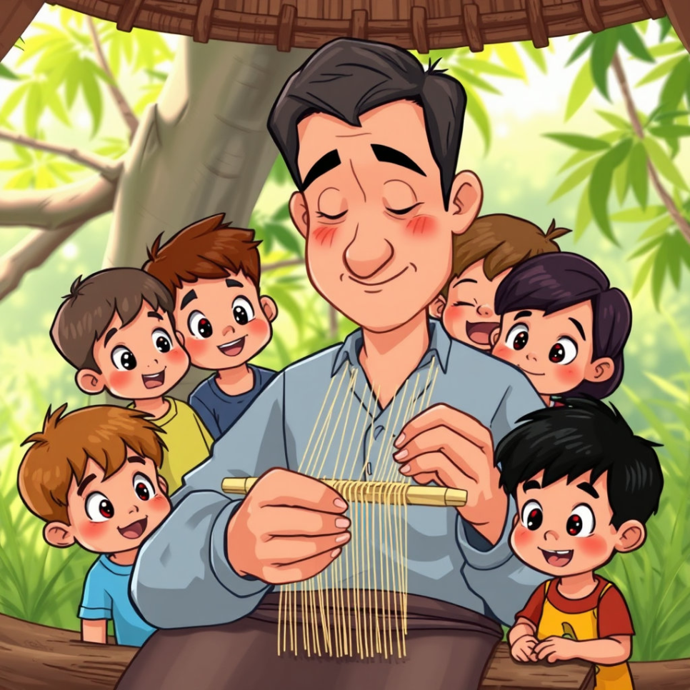 염색한 대나무 실은 이제 베틀이라는 특별한 기계로 짜야 해요. 베틀은 오래된 나무로 만들어졌고, 커다란 손잡이를 힘껏 돌려야 천이 만들어져요. 사람들은 서로 도와가며 힘을 모아 베틀을 돌렸어요. 베틀에서 짜여 나오는 천은 점점 모양이 잡히고 단단해졌죠. 이 과정은 오래 걸리고 아주 힘들지만, 모두가 땀 흘리며 최선을 다했답니다. 아이들은 고된 일도 신기한 베틀 소리와 함께 즐겁게 지켜봤어요.