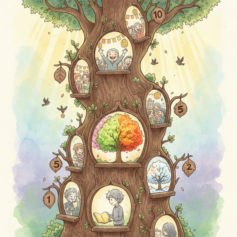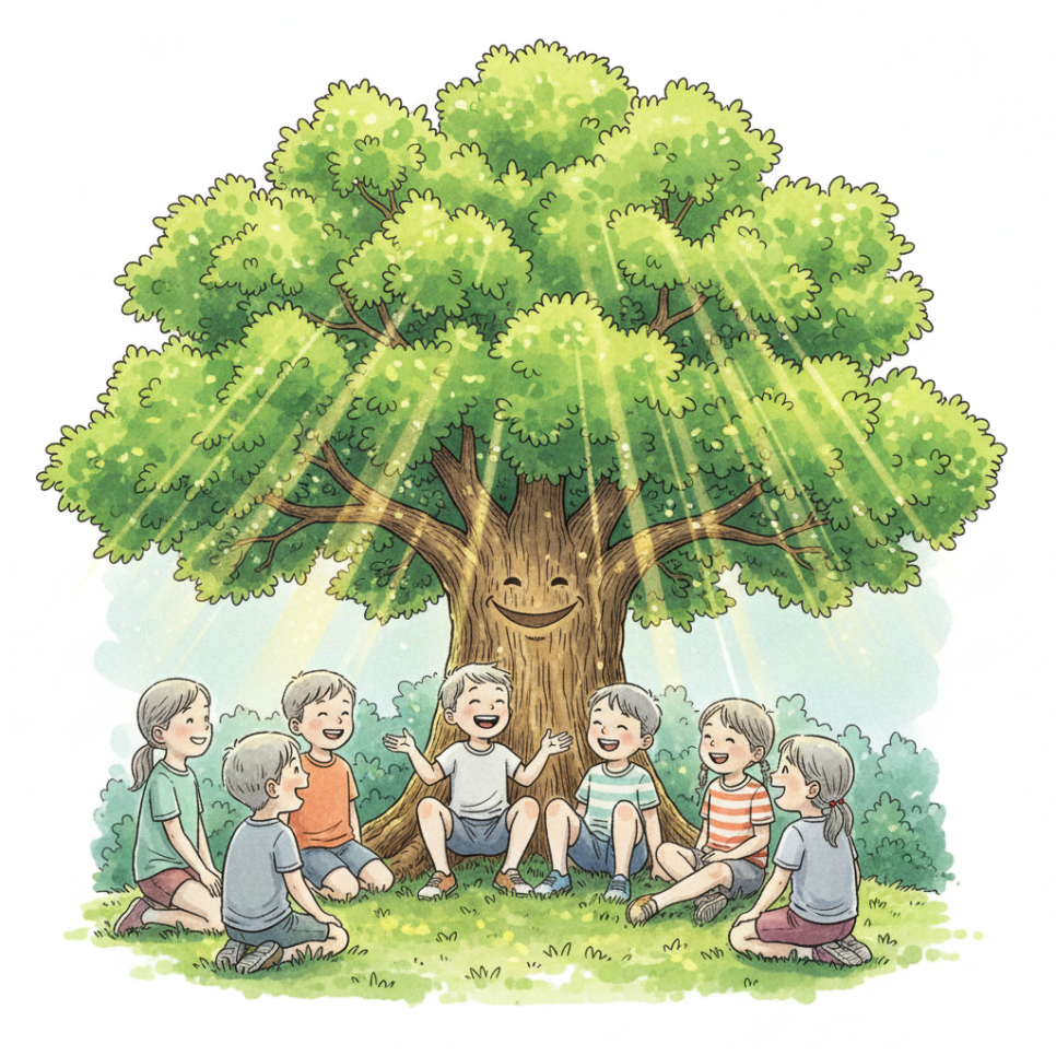 아이들은 숨죽이고 들었고, 어른들은 고개를 끄덕였습니다. 그리고 모두가 깨달았습니다. 우리 모두에게는 저마다의 나무가 필요하다는 것을. 우리의 이야기를 판단하지 않고 들어줄 누군가, 지혜를 나눠줄 누군가, 그리고 우리가 다시 말할 수 있을 때까지 조용히 기다려줄 누군가.