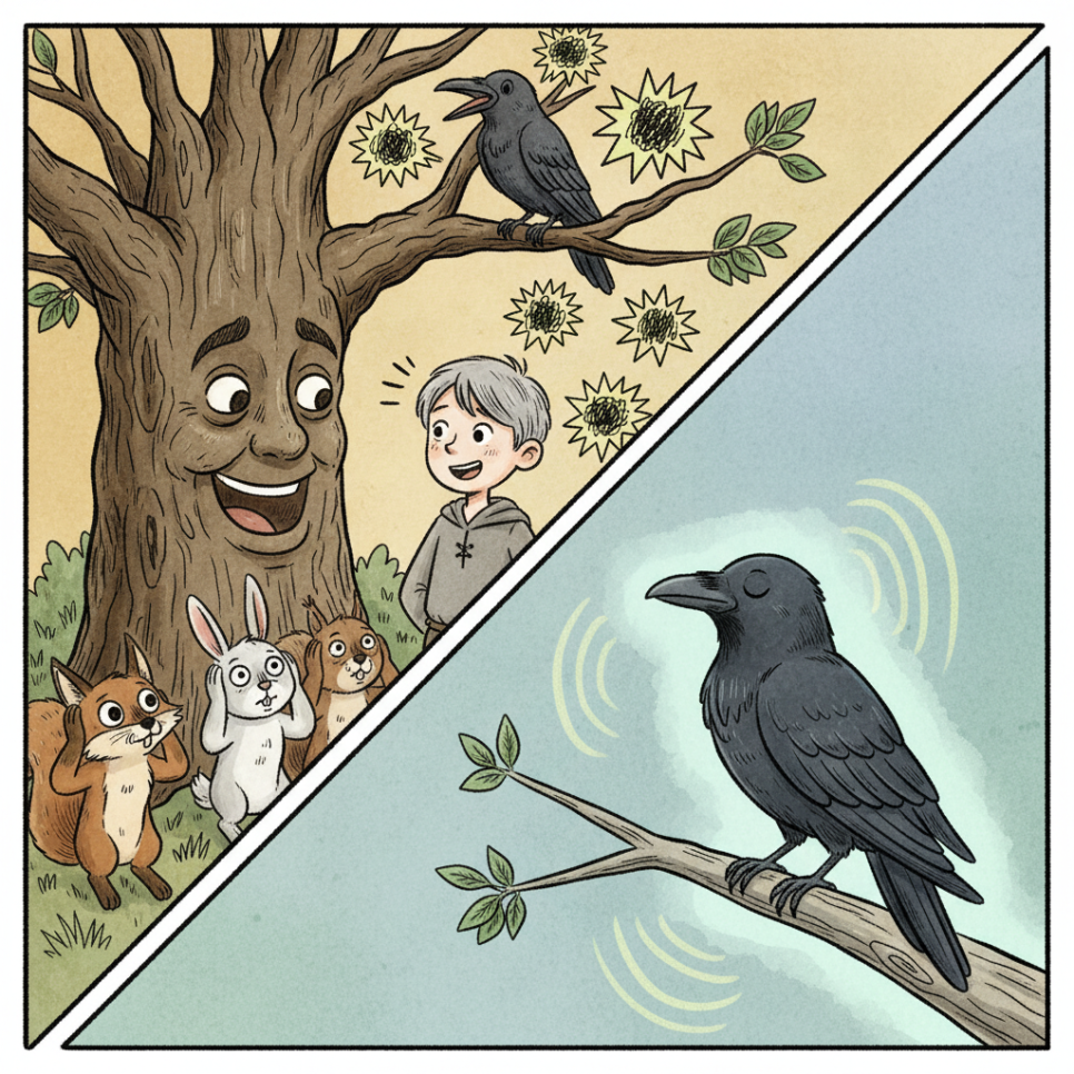 "아주 오래전, 이 숲에는 말을 너무 많이 하는 까마귀가 살았단다. 그 까마귀는 아침부터 저녁까지 쉬지 않고 떠들었지. 다른 새들의 소식을 이리저리 전하고, 숲 속 동물들의 비밀을 큰 소리로 떠들어댔어. 처음에는 재미있었지만, 점점 모두가 지쳐갔지. 까마귀의 말 때문에 친구들이 다투기도 하고, 오해가 생기기도 했거든."
