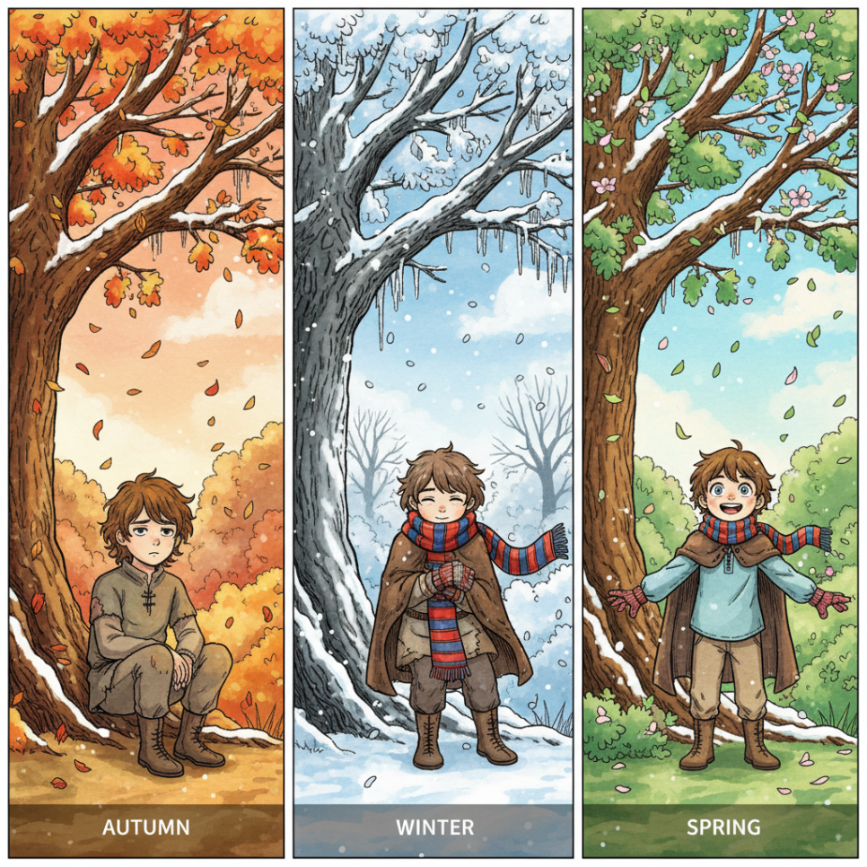 나무는 한스에게 계절의 지혜를 가르쳐주었습니다. "봐, 한스야. 나는 겨울에 모든 잎을 떨어뜨린단다. 하지만 이것은 죽음이 아니야. 새로운 봄을 준비하는 시간이지. 때로는 모든 것을 내려놓아야 새로운 시작을 할 수 있어."