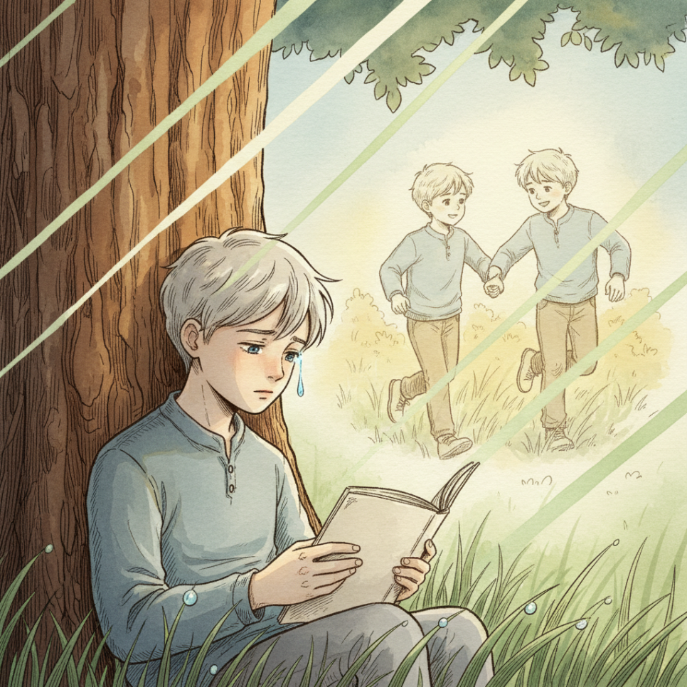 아버지는 나무에 기대어 조용히 앉아있는 아들의 뒷모습을 보며 눈시울이 붉어졌습니다. 아들이 혼자가 아니었구나. 아들은 자신만의 방법으로 치유되고 있었구나. 아버지는 조용히 뒤로 물러나 집으로 돌아왔고, 그날 밤 어머니에게 모든 것을 이야기했습니다.