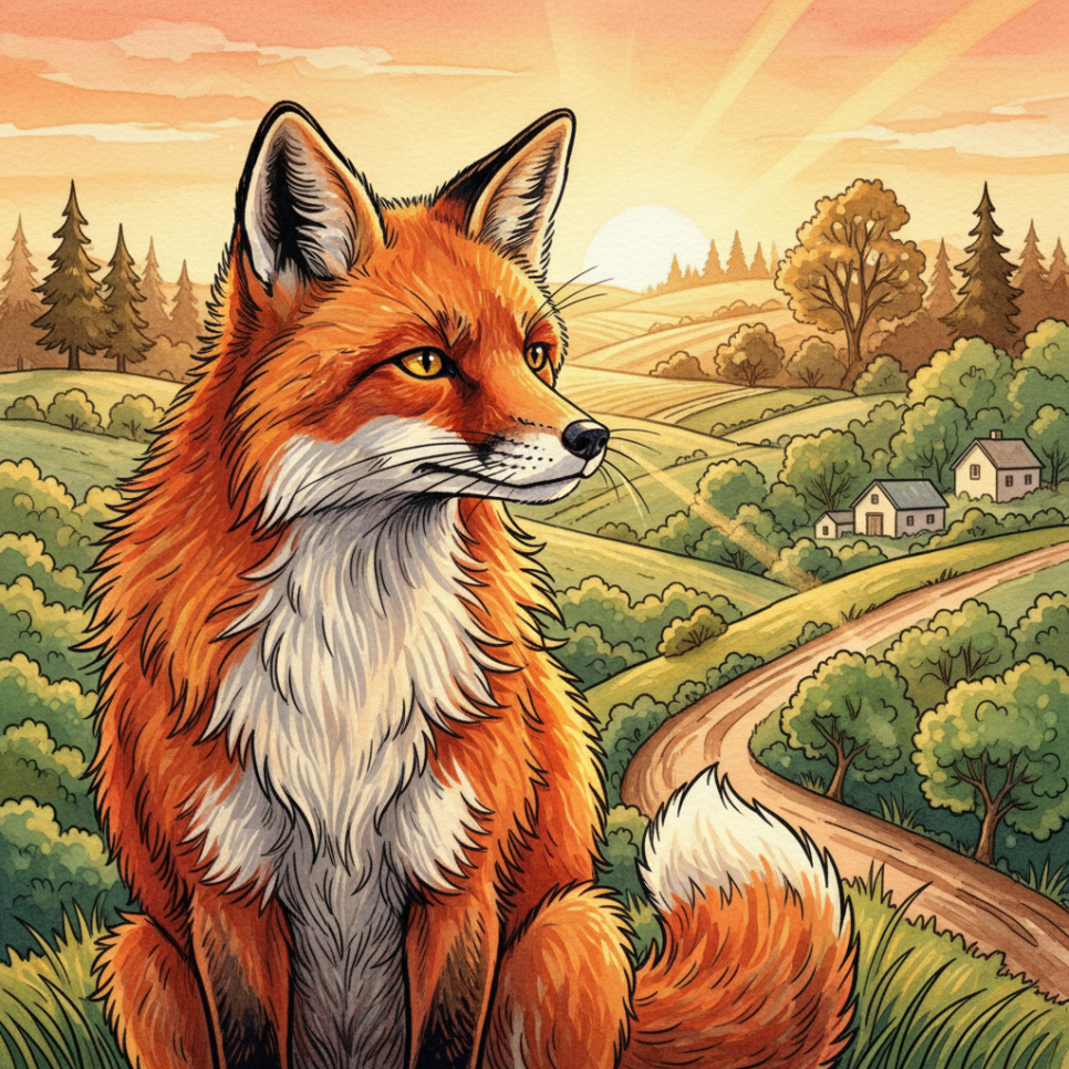 어느 날, 폭스는 숲 끝자락에 있는 언덕에 올랐어요. 그곳에서 내려다본 풍경은 정말 아름다웠지요. 초록빛 들판 너머로 아담한 집 한 채가 보였고, 집 옆에는 탐스러운 과일나무들이 가득했어요.