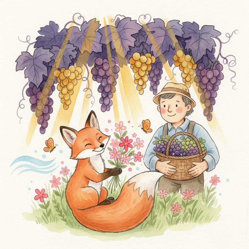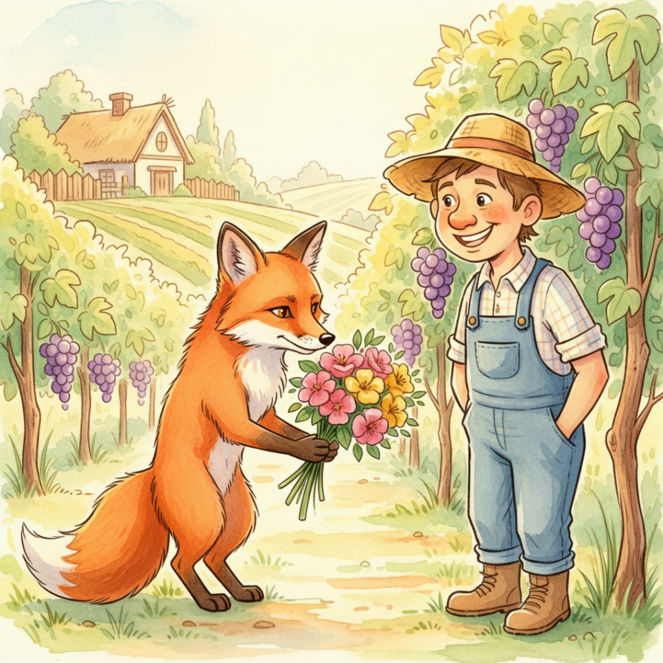 깊은 숲 속, 배고픈 여우 폭스는 매일 먹을 것을 찾아 헤맵니다. 어느 날 언덕에서 내려다본 농장의 탐스러운 포도송이들. 폭스는 영리한 계획을 세웁니다. 들꽃 다발을 들고 농부를 찾아가 거짓말을 하는 것입니다.