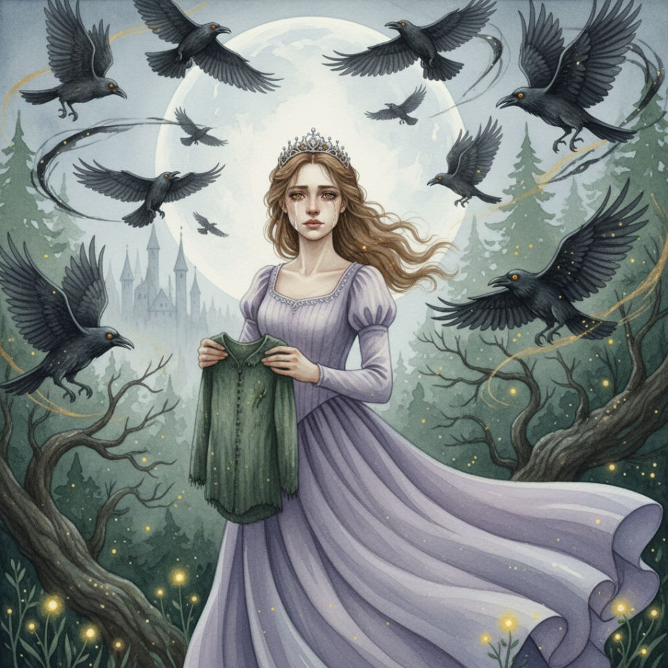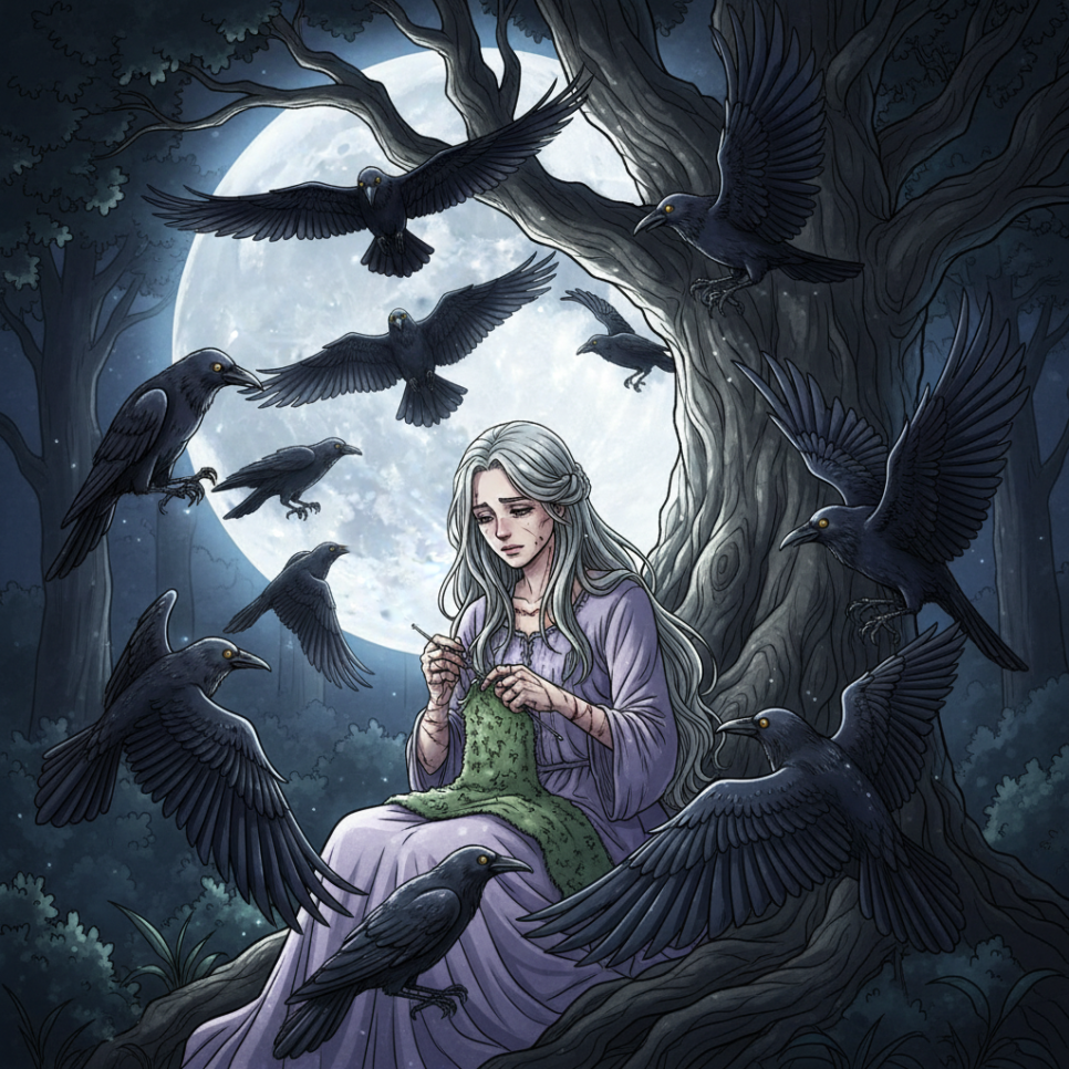 까마귀들도 밤새 창가에서 공주를 지켰습니다. 마치 함께 기도하는 것처럼 조용히 앉아 있었습니다. 동이 트기 시작했을 때, 공주는 마지막 바늘땀을 꿰매고 있었습니다. 손이 떨렸지만 정확하게 바늘을 움직였습니다.