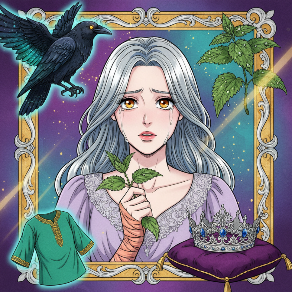 하지만 공주는 절망하지 않았습니다. 비록 목소리는 없었지만, 공주의 마음속에는 오빠들을 향한 뜨거운 사랑이 있었습니다. 그리고 마침내 열여섯 살이 되던 해, 공주는 저주를 풀 수 있는 방법을 알게 됩니다. 가시 돋친 쐐기풀로 열 벌의 셔츠를 만들어야 한다는 것이었습니다.