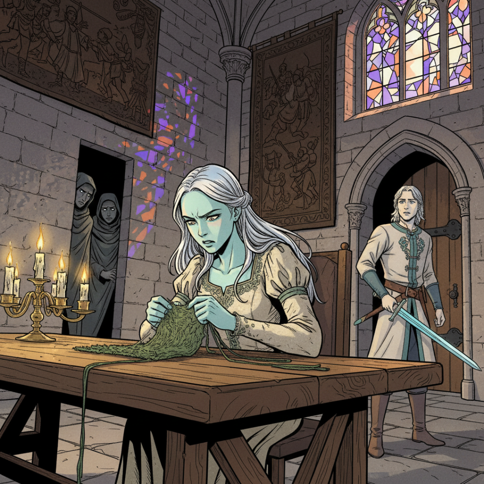 며칠이 지나자 공주의 손은 상처투성이가 되었습니다. 손가락은 부어올랐고, 피가 나기도 했습니다. 하지만 공주는 멈추지 않았습니다. 하루 종일 쐐기풀 실을 잣고, 천천히 직물을 짜 나갔습니다. 첫 번째 셔츠가 완성되기까지 일주일이 걸렸습니다.