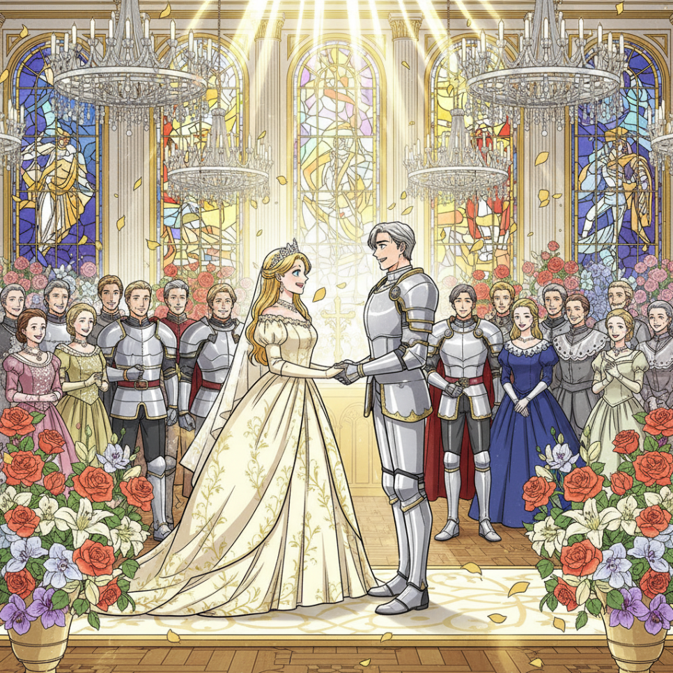 왕자는 공주에게 청혼했습니다. "공주님의 용기와 사랑을 보았습니다. 저와 함께 해주시겠습니까?" 공주는 미소 지으며 고개를 끄덕였습니다. 두 왕국은 하나가 되었고, 성대한 결혼식이 열렸습니다.
