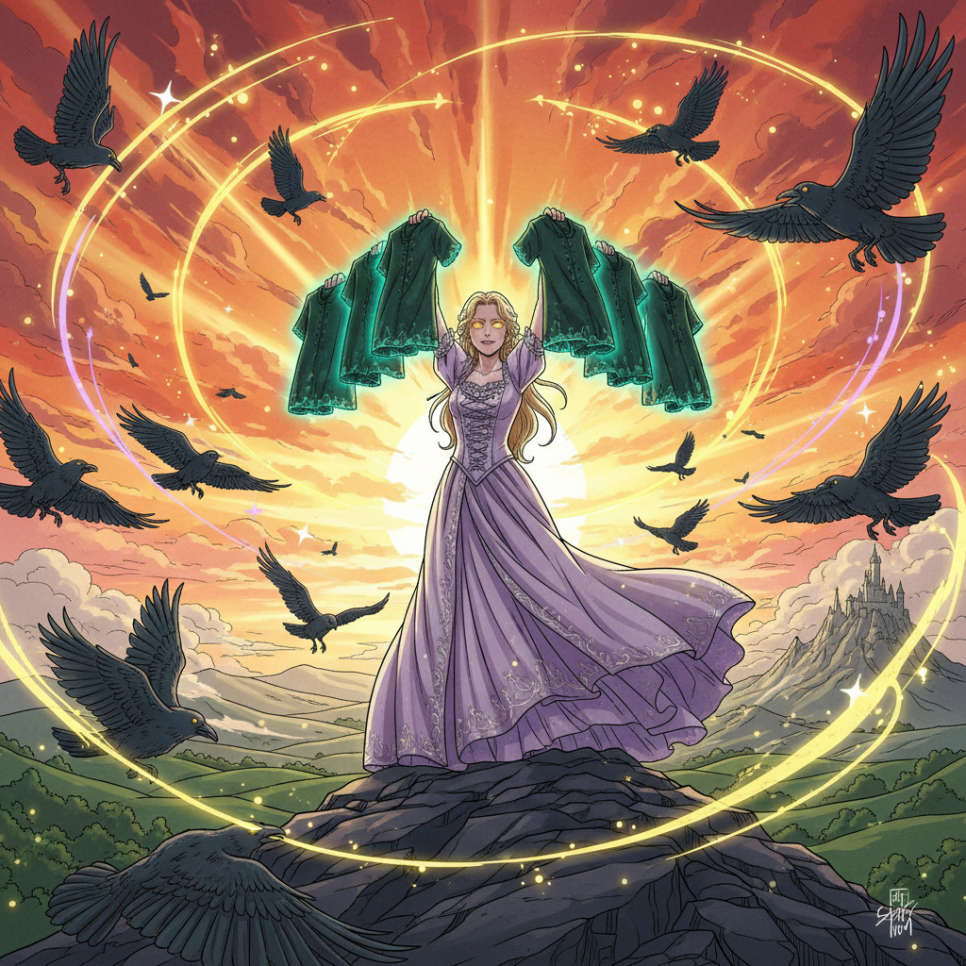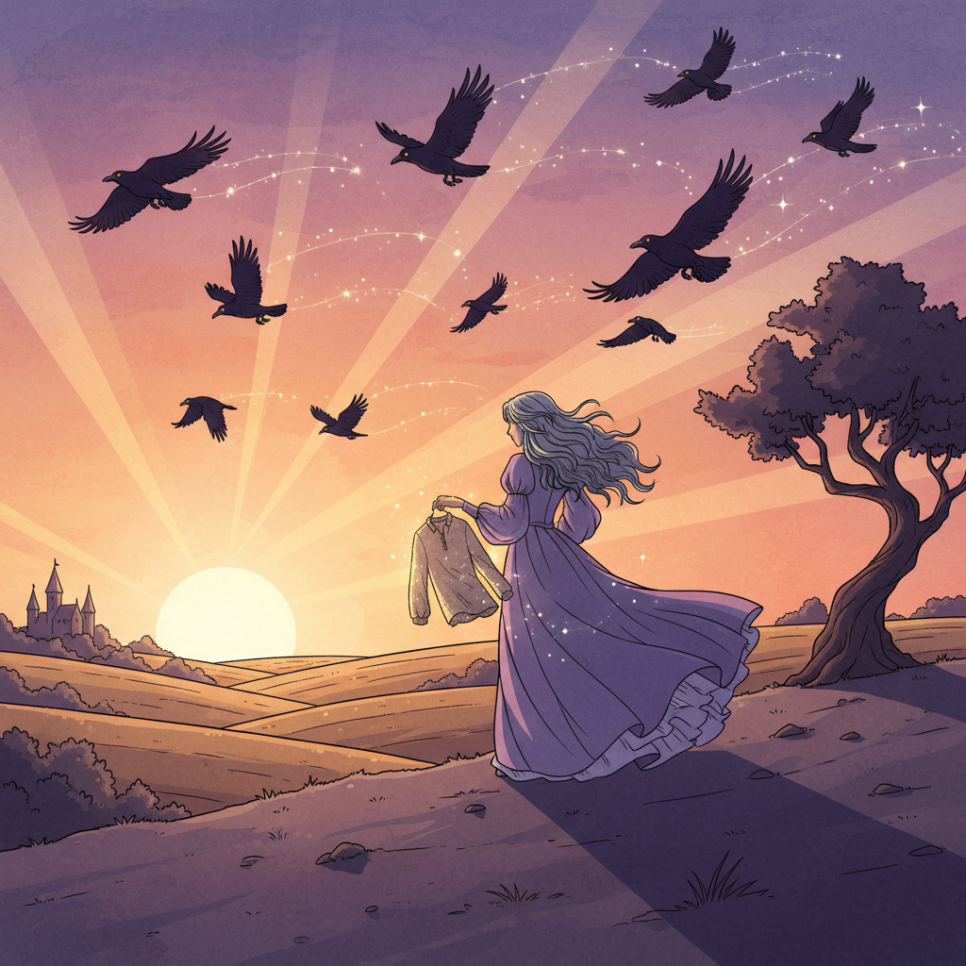 시간은 흐르고, 마침내 열 번째 셔츠가 완성됩니다. 그리고 기적 같은 순간이 찾아옵니다. 까마귀들이 셔츠를 입자 다시 사람으로 돌아오고, 공주도 목소리를 되찾게 됩니다. 처음으로 "사랑해요"라고 말할 수 있게 된 공주의 목소리는, 그 어떤 노래보다 아름답습니다.