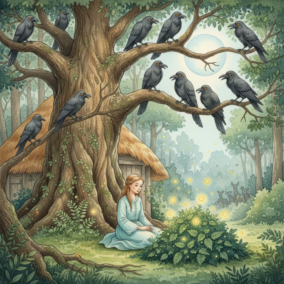 공주는 오래된 나무 밑에 자리를 잡았습니다. 그곳에 작은 움막을 만들고 쐐기풀을 모았습니다. 까마귀가 된 오빠들이 공주를 찾아와 나무 위에서 공주를 지켜보았습니다. 그들은 여동생이 무엇을 하려는지 알 수는 없었지만, 걱정스러운 눈빛으로 공주를 바라보았습니다.