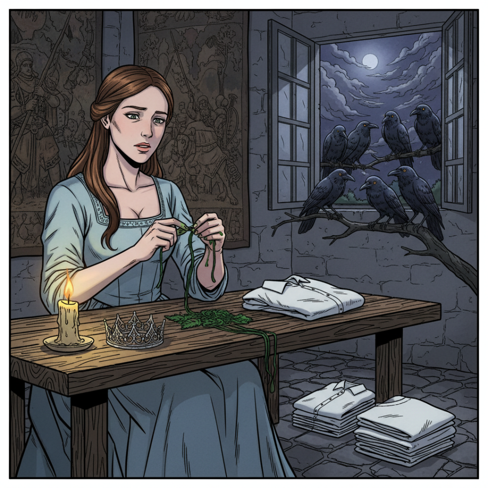 하지만 조건은 가혹했습니다. 셔츠를 완성할 때까지 절대 웃어도, 울어도 안 되며, 그 누구에게도 이 일에 대해 설명할 수 없다는 것입니다. 만약 이 규칙을 어기면 오빠들은 영원히 까마귀로 남게 됩니다.