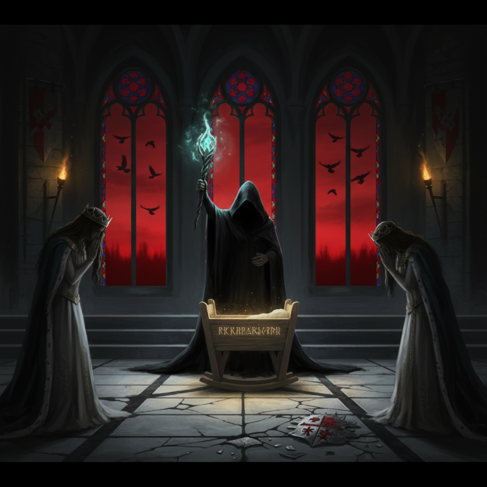 마녀는 분노에 가득 차 왕궁으로 찾아왔습니다. "감히 나를 초대하지 않다니!" 마녀는 요람 속 아기 공주를 내려다보며 무서운 저주를 걸었습니다. "이 아이는 평생 단 한마디도 말을 하지 못할 것이다. 그리고 이 아이의 열 명의 오빠들은 모두 까마귀로 변할 것이다!"