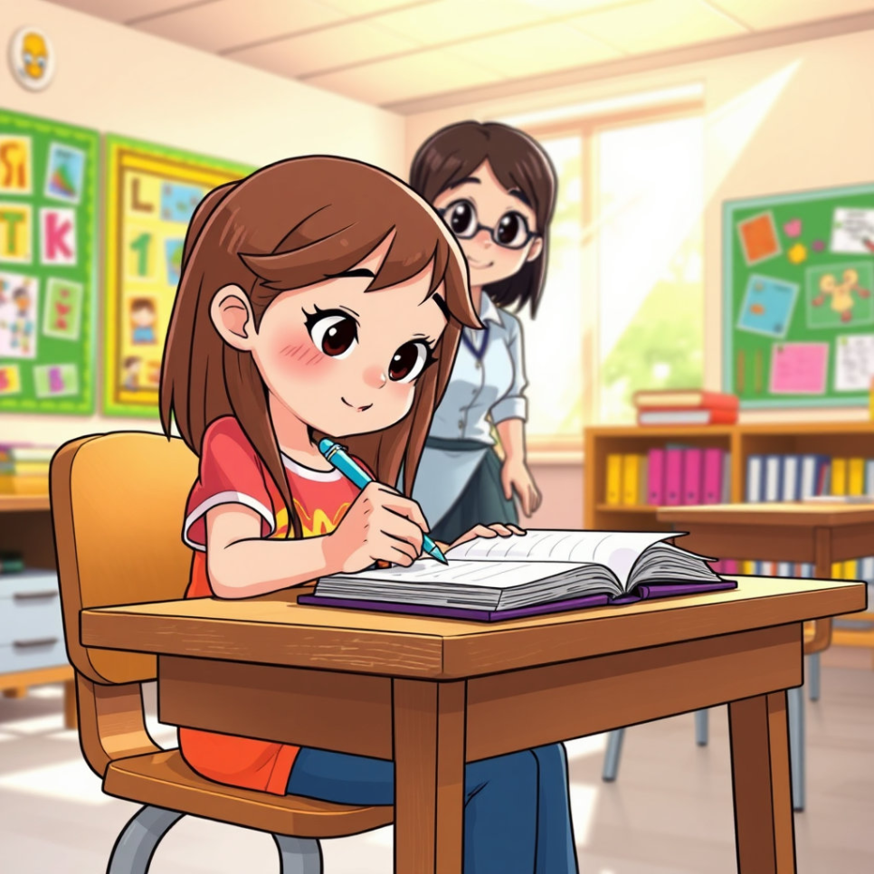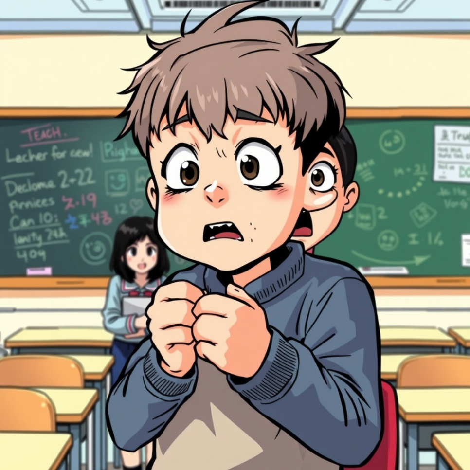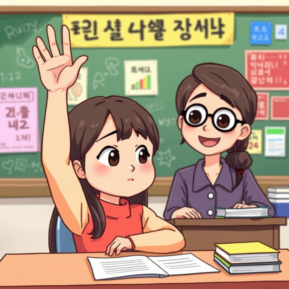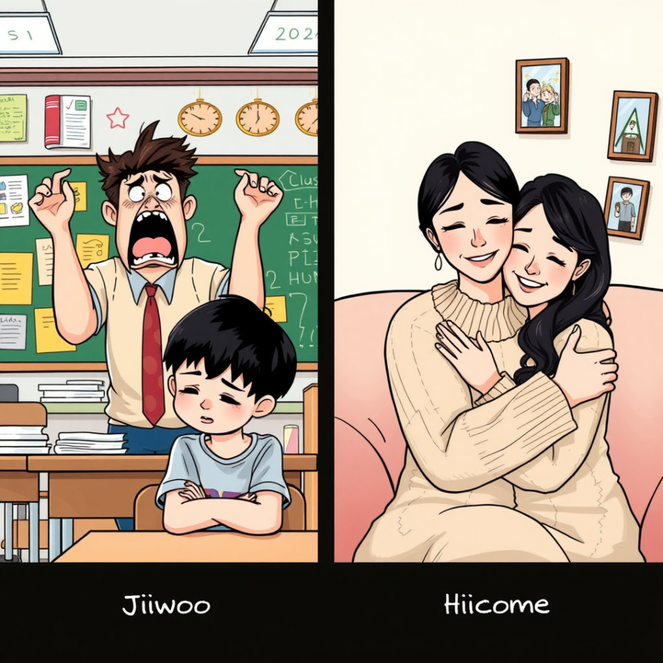 지우는 문제를 풀지 못해 머뭇거렸고, 선생님은 목소리를 높였어요. 아이들은 조용해졌고 지우는 고개를 숙였어요. 그날 집에 와서 엄마에게 말했어요. “선생님이 너무 화를 내셨어요.” 엄마는 지우를 안아주며 말했어요. “화낼 일과 말로 설명할 일은 다르단다. 내일 선생님과 이야기해보자.” 지우는 용기를 냈어요.
