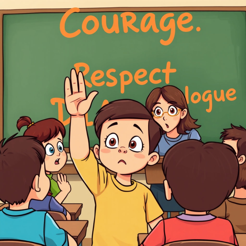 수업 중 선생님이 “모든 아이는 똑같이 생각해야 해요”라고 말했어요. 다윤이는 마음이 답답했어요. ‘나는 다르게 생각하는 게 좋은데...’ 쉬는 시간에 다윤이는 용기를 내어 말했어요. “선생님, 저도 제 생각을 말해도 돼요?” 선생님은 잠시 멈췄지만, 미소 지으며 대답했어요. “그래, 다윤아. 네 생각을 말해줘서 고마워.”