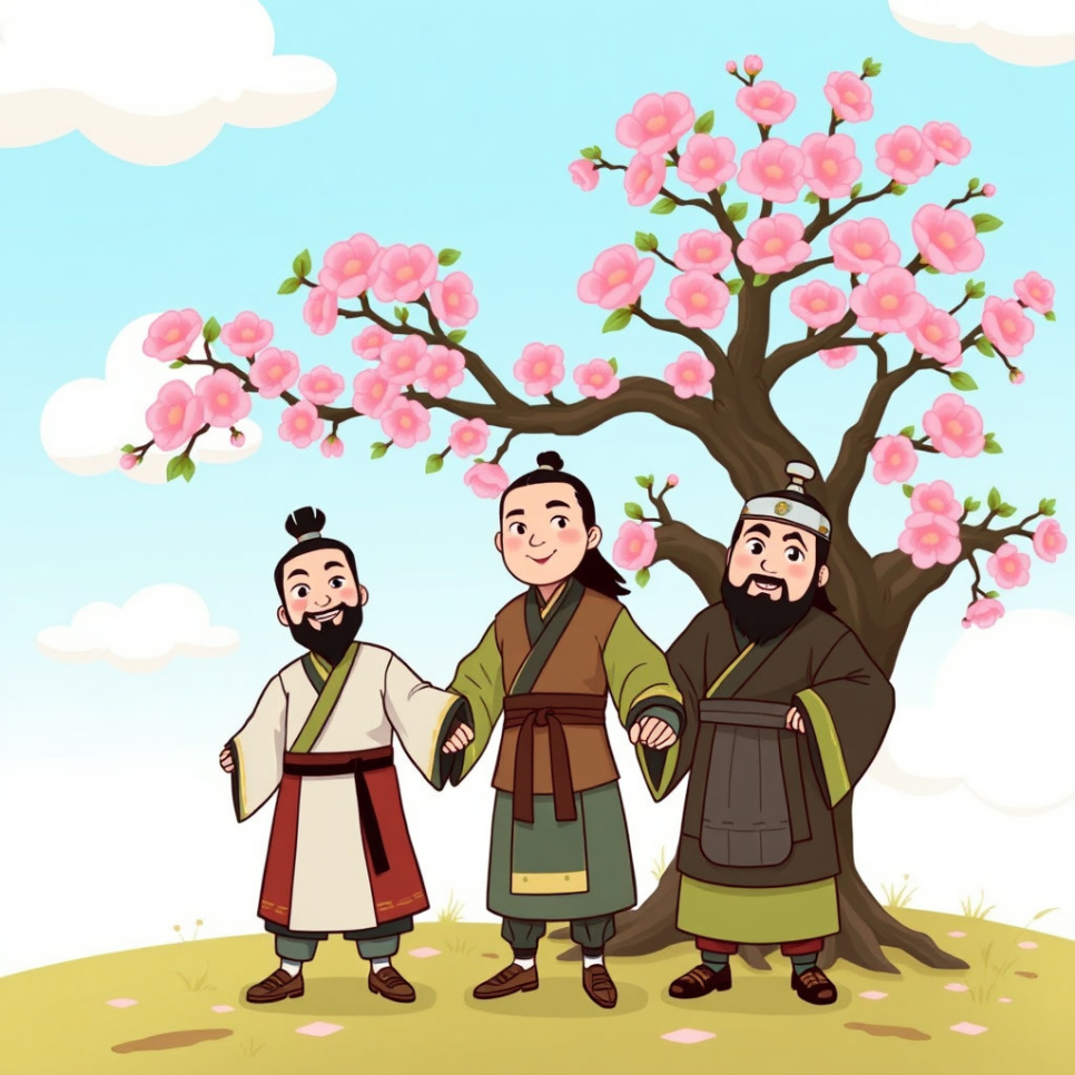 어느 날 유비는 관우와 장비라는 훌륭한 사람들을 만나게 되었어요. 세 사람은 세상을 올바르게 만들겠다는 꿈을 가지고 도원이라는 복숭아나무 아래에서 의형제를 맺었답니다. “우리의 마음은 하나! 어려운 일이 있어도 절대 등을 돌리지 말자!” 세 사람은 그렇게 약속하고, 어려운 길을 함께 걷기로 했어요. 유비는 언제나 형제들을 먼저 생각하며, 함께 걷는 길을 소중히 여겼답니다.