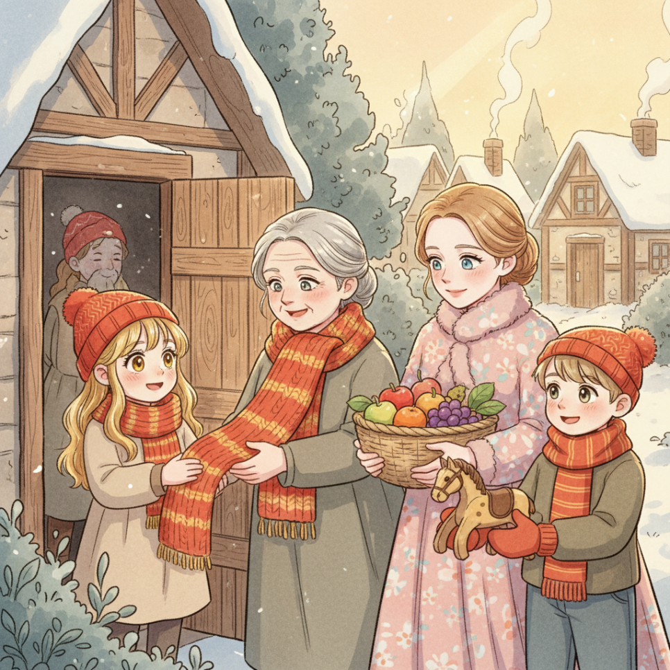 빈손으로 집에 돌아온 리나를 엄마는 꾸짖지 않았습니다. 오히려 리나를 꼭 안아주며 자랑스럽다고 말했습니다. 그날 밤, 놀라운 일이 일어났습니다. 리나가 도왔던 사람들이 하나둘씩 찾아와 감사의 마음을 전했습니다. 할머니는 따뜻한 음식을, 젊은 엄마는 담요와 옷을, 남자아이의 가족은 장작과 음식을 가져왔습니다.