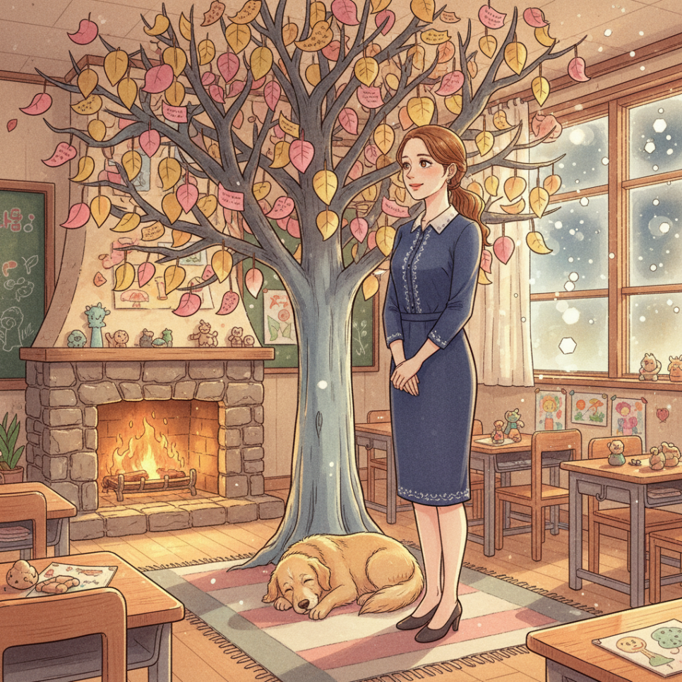 리나가 가르치는 교실에는 특별한 '나눔 나무'가 있습니다. 아이들은 누군가를 도왔을 때마다 나뭇잎 모양의 종이에 그 경험을 적어 나무에 붙입니다. "할머니 짐 들어드렸어요", "동생과 간식을 나눠 먹었어요", "친구가 슬플 때 옆에 있어줬어요"... 작은 나뭇잎들이 모여 나눔 나무는 점점 무성해졌습니다.