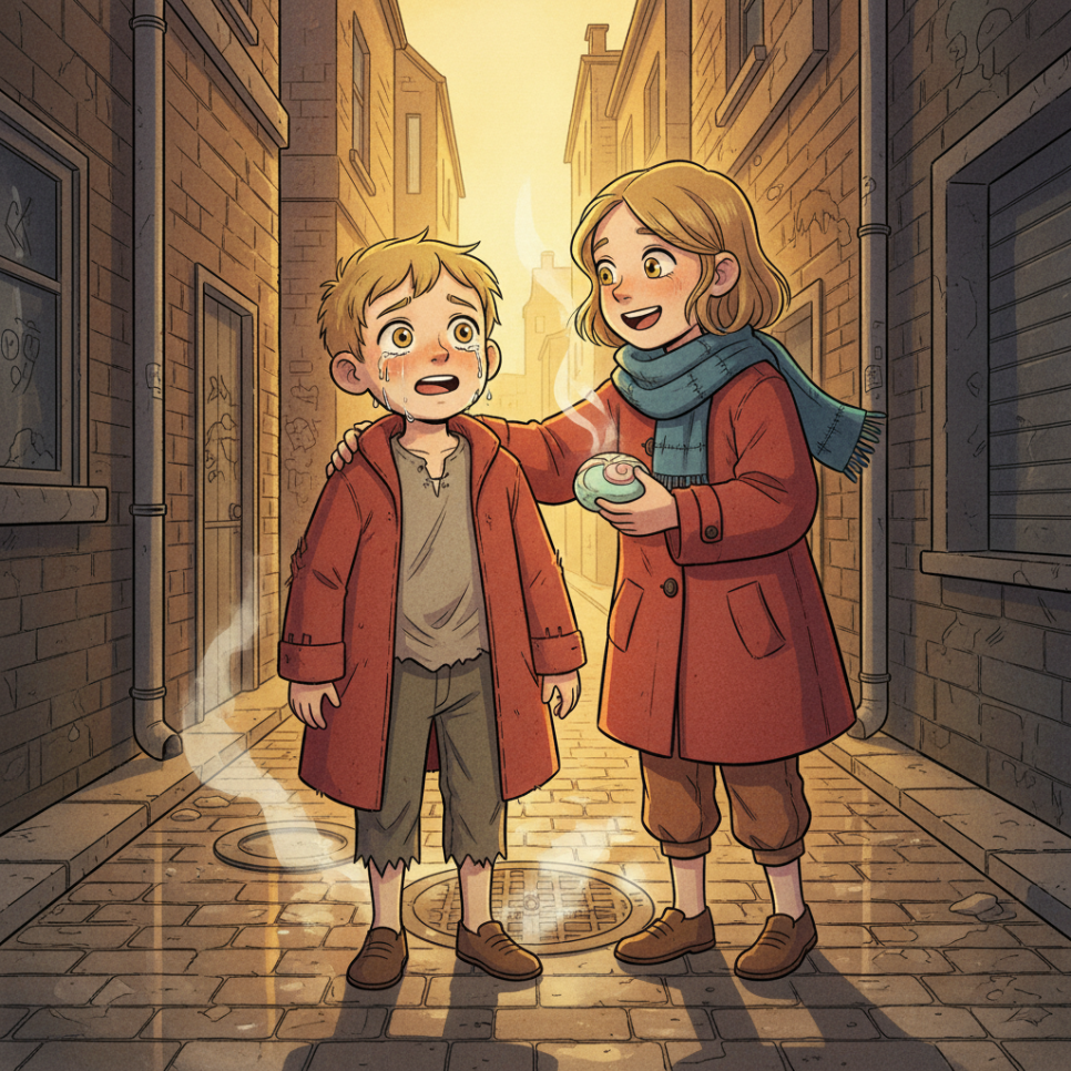 리나는 자신의 낡은 외투를 벗어 아이에게 입혀주었습니다. "이거 입어. 조금은 따뜻할 거야." 그리고 바구니에서 남은 빵 조각을 꺼냈습니다. 이제 정말 작은 조각만 남았습니다.