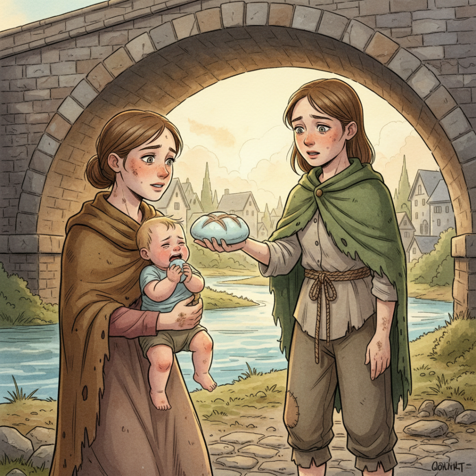 여인은 감격해하며 빵을 받았습니다. "정말 고마워요, 천사 같은 아이야." 여인은 빵을 조금씩 뜯어 아기에게 먹였습니다. 아기는 빵을 먹으며 울음을 그쳤고, 여인은 안도의 한숨을 쉬었습니다.
