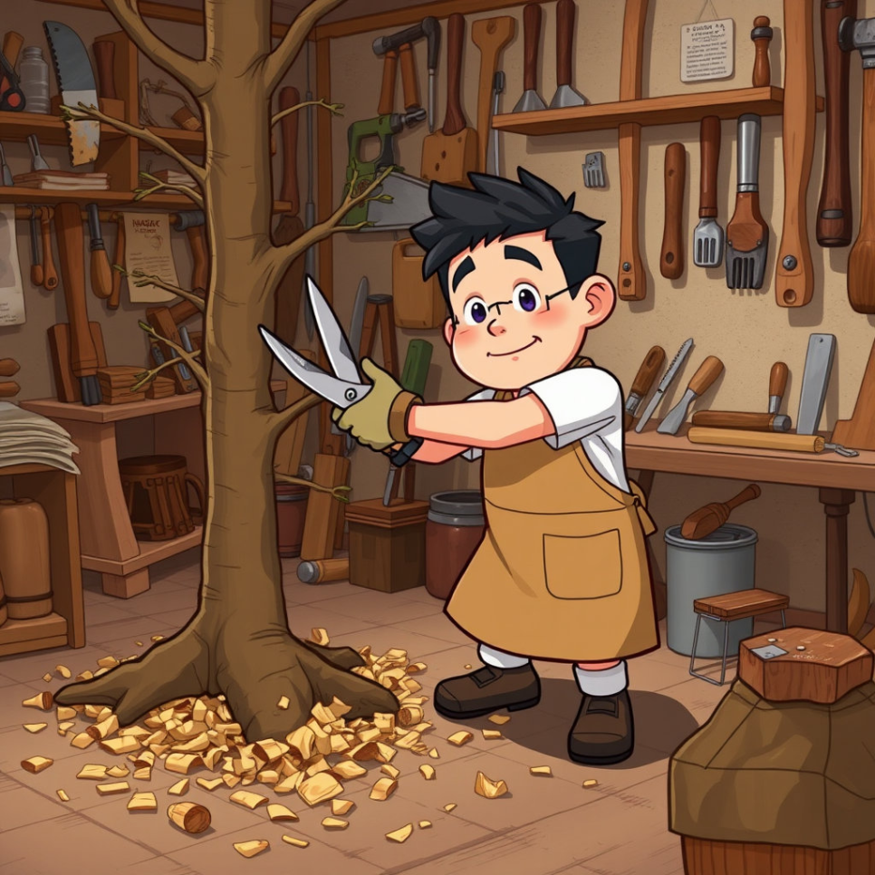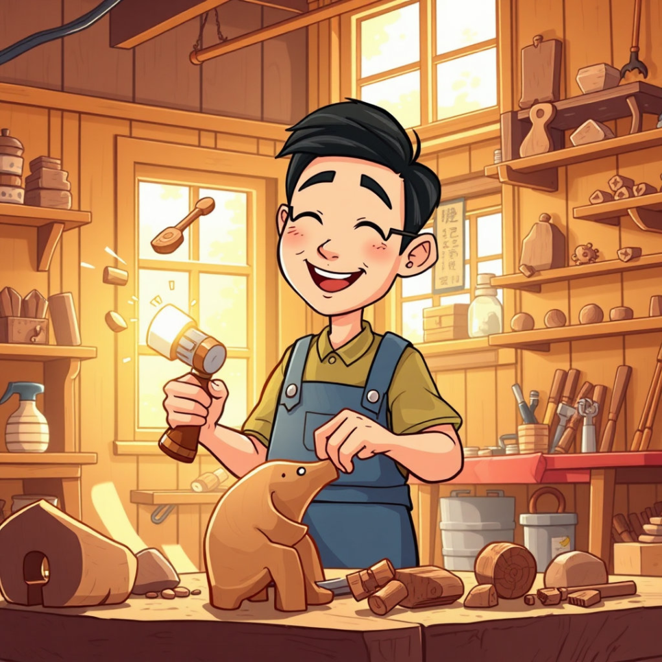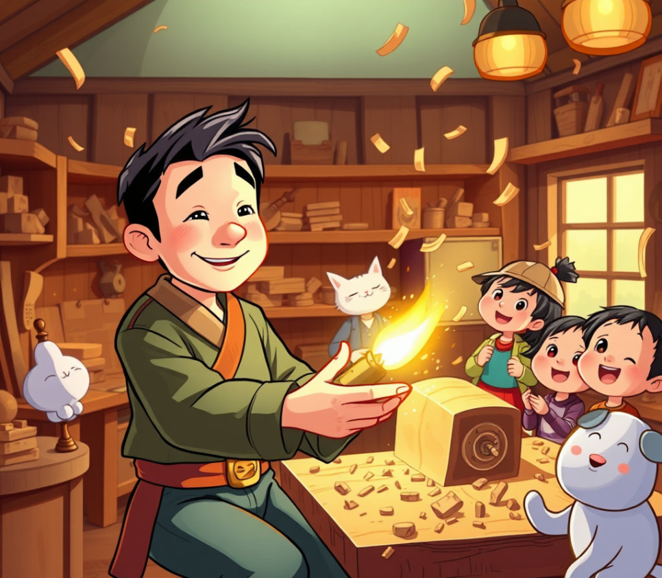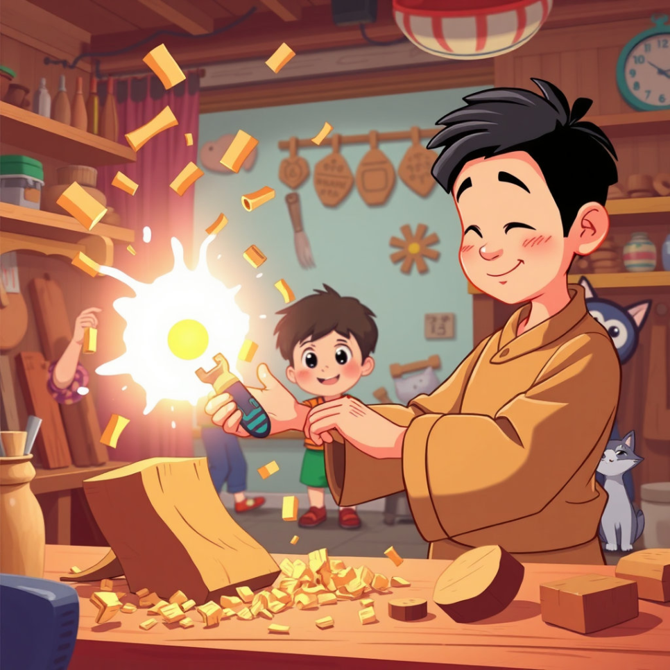 마을 한가운데, 작은 공방에서 일하는 목수 민수는 나무를 다루는 걸 좋아했다. "뚝닥, 뚝닥!" 나무를 자르고, 쪼고, 다듬으며 세상에서 가장 멋진 물건들을 만들었다. 오늘은 특별한 나무 한 그루가 공방에 들어왔다. 민수는 그 나무를 보고 무엇을 만들지 고민하며 나무를 다듬기 시작했다.