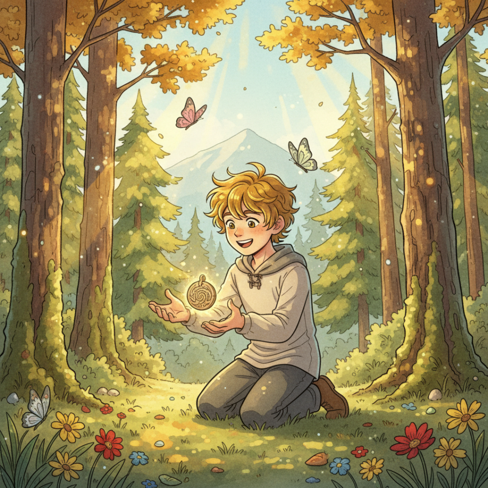 날이 밝자마자 한스는 다시 숲으로 향했습니다. 이번에는 혼자였습니다. 어젯밤 검은 그림자가 떨어뜨린 것을 찾고 싶었기 때문입니다. 낮의 숲은 밤과는 전혀 달랐습니다. 햇살이 나뭇잎 사이로 따사롭게 내려와 숲 전체가 평화로워 보였습니다.