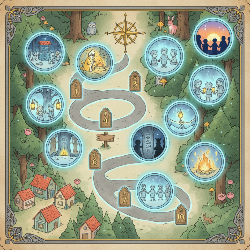 마침내 보름달이 뜬 밤, 세 친구는 몰래 집을 빠져나왔습니다. 한스는 약속대로 랜턴을 들고, 그레텔은 빵과 물이 든 작은 가방을, 프리츠는 떨리는 손으로 나무 막대기를 꼭 쥐고 있었습니다.