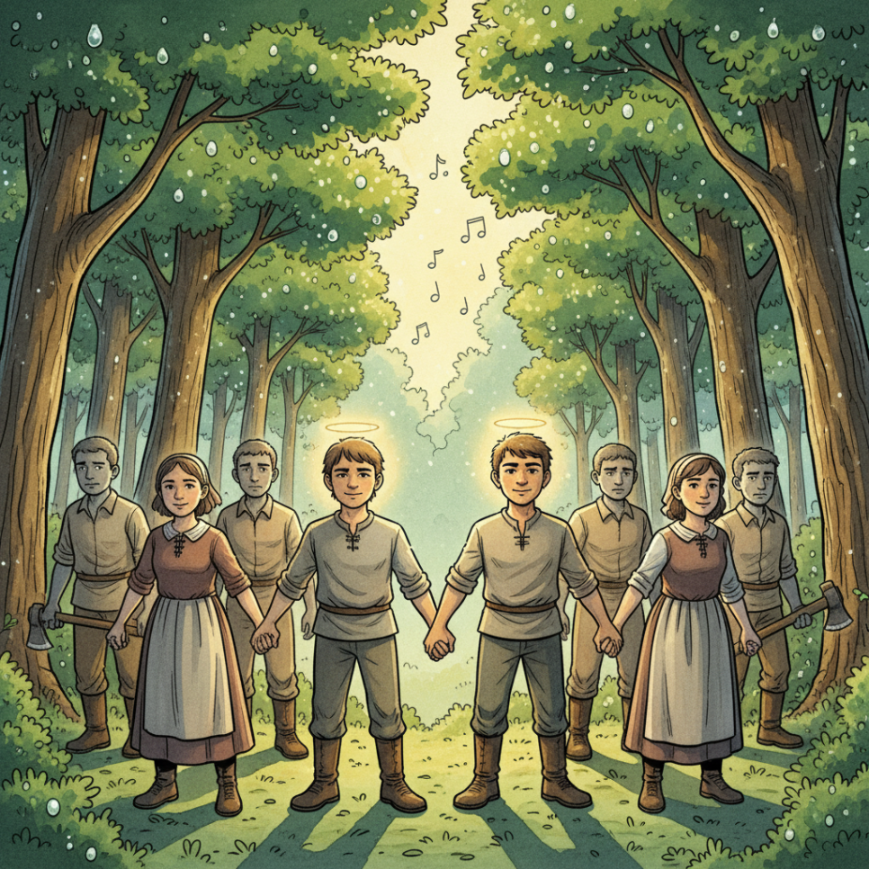 마침내 마을 사람들은 이해하게 되었습니다. 그들은 삽과 낫, 횃불을 들고 숲으로 향했습니다. 벌목꾼들이 나무를 베려 할 때, 마을 사람들이 앞을 막아섰습니다. "이 숲은 우리의 생명입니다. 베어갈 수 없습니다!"