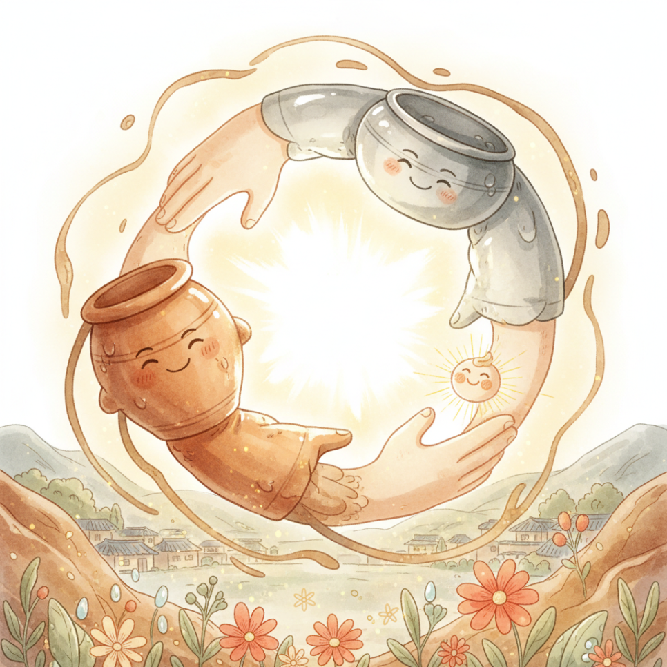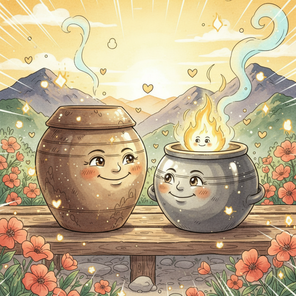 옹기 할아버지와 뚝배기는 같은 흙에서 태어났어요. 다른 모습, 다른 역할이었지만 모두 소중했지요. 오늘도 옹기는 숨 쉬며 기다리고, 뚝배기는 끓이며 나눕니다. 흙마을의 하루는 그렇게 따뜻하게 이어졌어요.