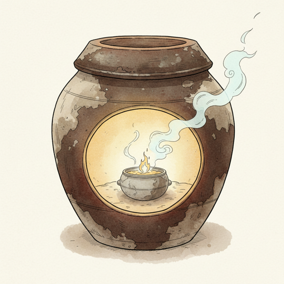 어느 날 밤, 뚝배기는 고민을 털어놓았어요. “나는 오래 남지 못해요.” 옹기 할아버지는 웃으며 대답했지요. “모든 그릇은 시간을 다르게 품는단다.” 어떤 그릇은 기다림으로, 어떤 그릇은 순간의 따뜻함으로 세상을 돕는다고요. 뚝배기는 처음으로 자신이 불 앞에 서는 이유를 알게 되었어요.