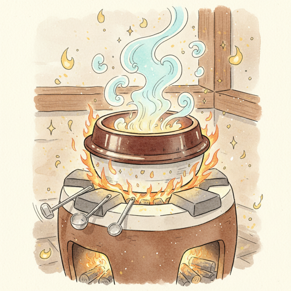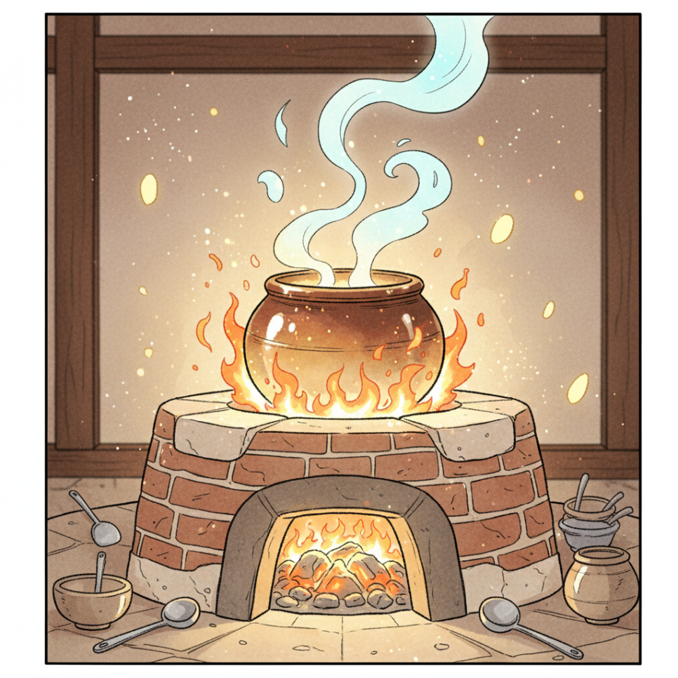 부엌 아궁이에 불이 피워지자 뚝배기는 덜덜 떨었어요. “나는 깨질지도 몰라…” 하지만 아주머니는 조심스럽게 뚝배기를 불 위에 올렸지요. 처음엔 뜨거웠고, 무서웠어요. 하지만 조금씩 몸이 따뜻해지자 이상하게도 힘이 생겼어요. 국물이 보글보글 끓기 시작했고, 뚝배기는 처음으로 자신이 무언가를 해내고 있다는 걸 느꼈어요.