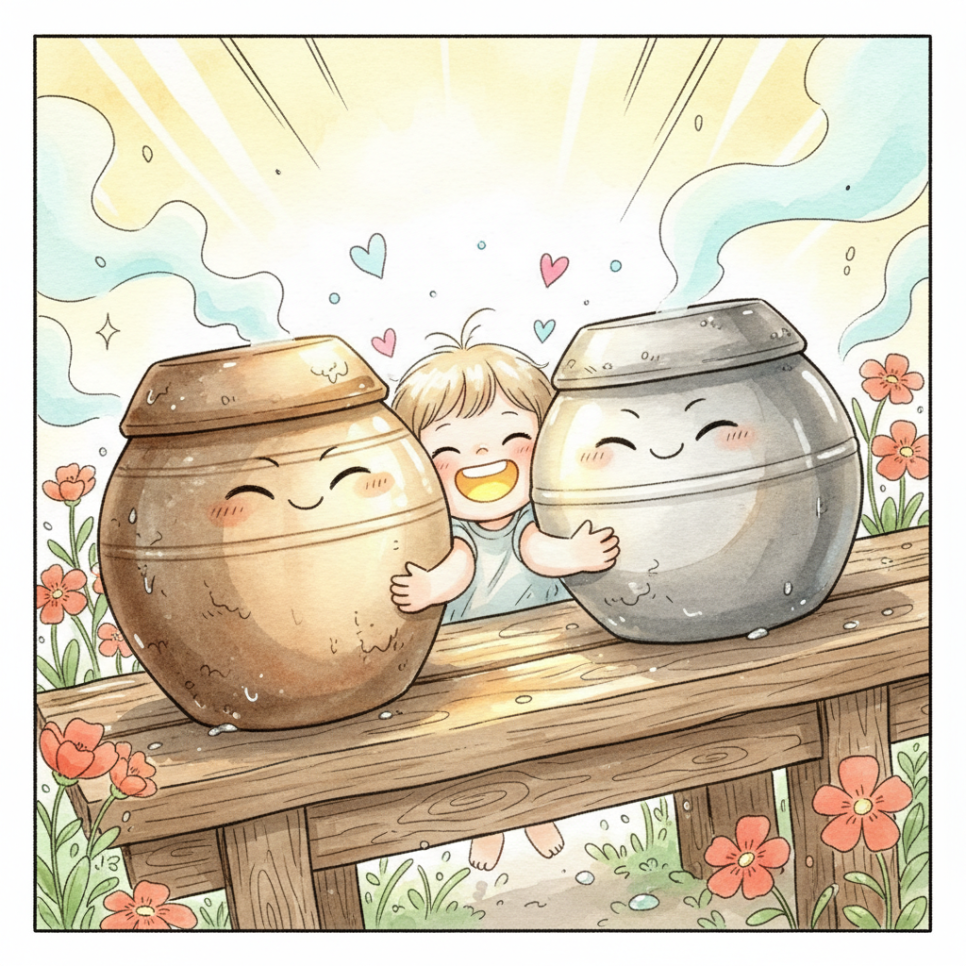《뚝배기와 옹기 할아버지》은 전통 그릇 ‘옹기’와 ‘뚝배기’를 주인공으로 한 마음 성장 동화입니다. 장독대에서 조용히 시간을 지켜 온 옹기 할아버지와, 불 위에서 용기를 배워 가는 작은 뚝배기의 이야기를 통해 아이들은 서로 다른 역할과 속도의 가치를 자연스럽게 만나게 됩니다.
