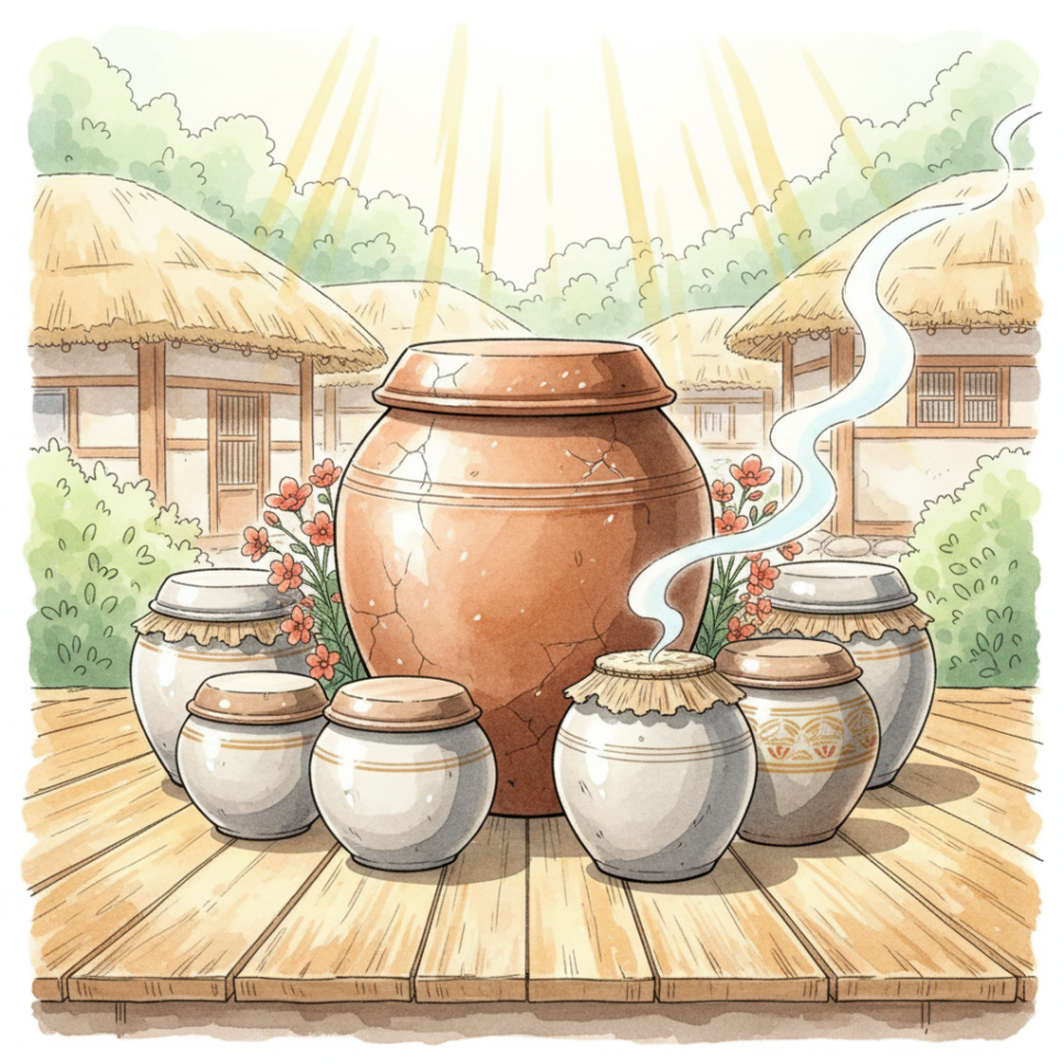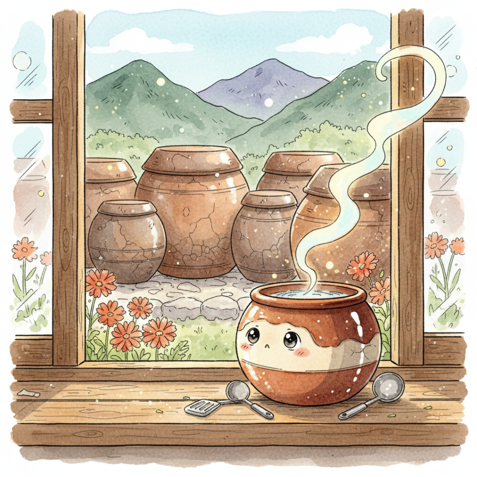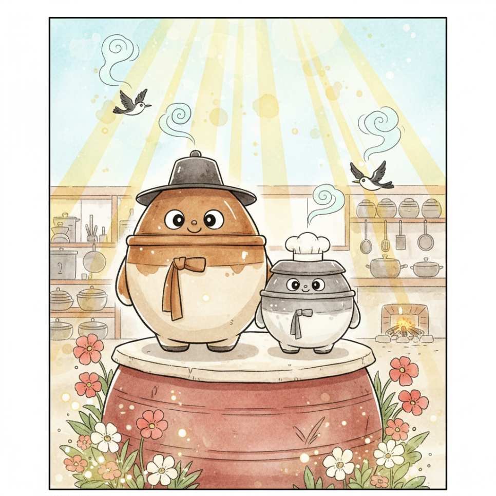 장독대는 조용했고, 부엌은 늘 바빴어요. 옹기 할아버지는 기다림의 하루를 살았고, 뚝배기는 움직임의 하루를 살았지요. 둘은 달랐지만 서로를 부러워하지 않았어요. 옹기 할아버지는 말했어요. “누군가는 오래 지켜야 하고, 누군가는 지금을 데워야 하지.” 뚝배기는 그 말이 조금씩 이해되기 시작했어요.