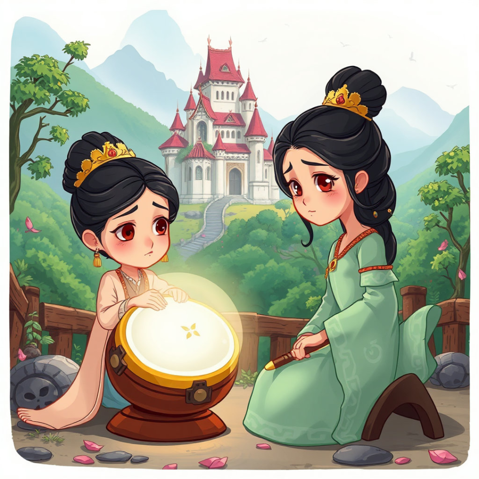 어느 날 밤, 호동 왕자는 괴로운 마음으로 공주에게 어려운 부탁을 했습니다. "공주… 저 신비한 북을… 울리지 못하게 해 줄 수 있겠소?" 공주는 깜짝 놀라 왕자를 바라보았습니다. 그 북은 낙랑을 지켜주는 소중한 존재였기 때문입니다. 공주는 깊은 고민에 빠졌습니다. 사랑하는 왕자님의 부탁을 들어야 할지, 자신의 나라를 지켜야 할지 갈등해야 했습니다.