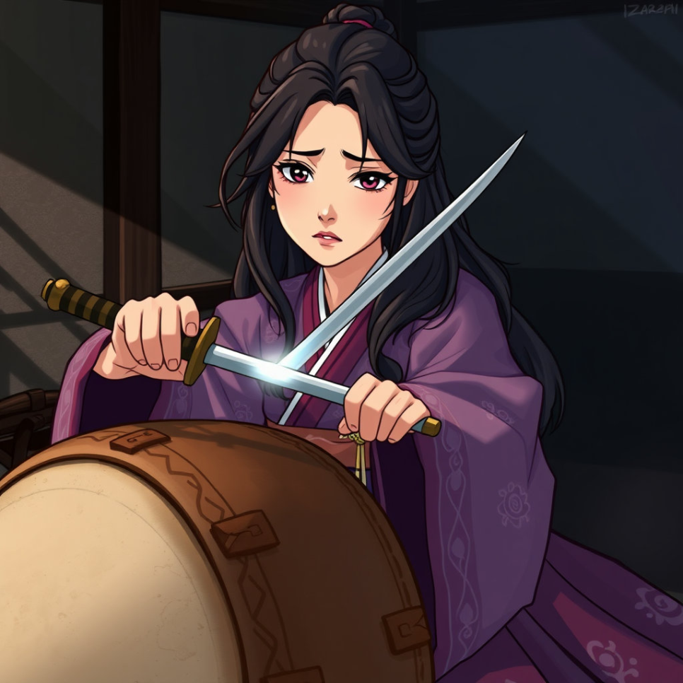 밤새도록 고민하던 공주는 마침내 용기 있는 결정을 내렸습니다. 사랑하는 호동 왕자를 믿고, 그의 부탁을 들어주기로 한 것입니다. 공주는 아무도 모르게 신비한 북이 울리지 않도록 칼로 조심스럽게 북의 가죽을 찢었습니다. 나라를 지키는 북이었지만, 사랑하는 사람의 간절한 부탁을 외면할 수 없었던 것입니다.